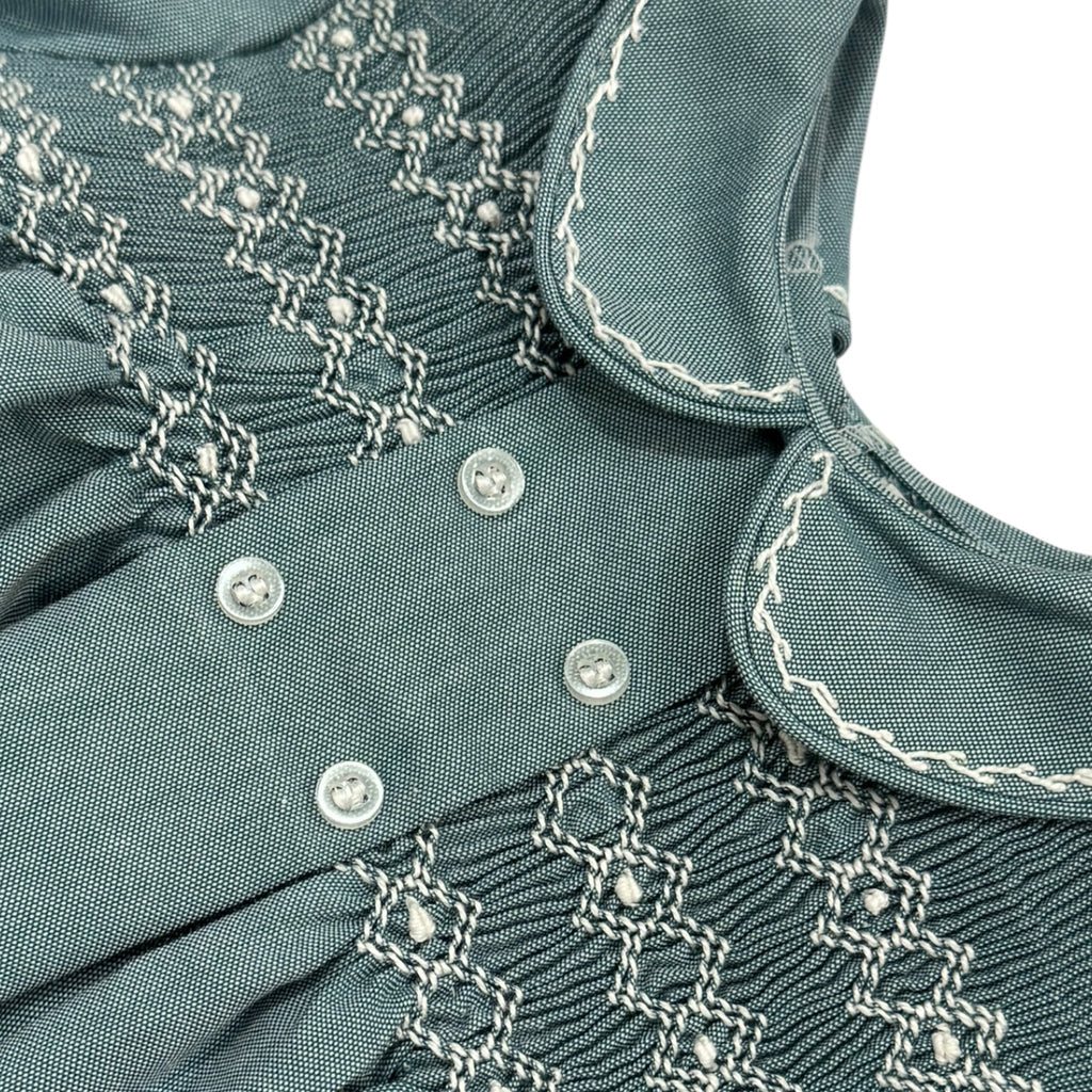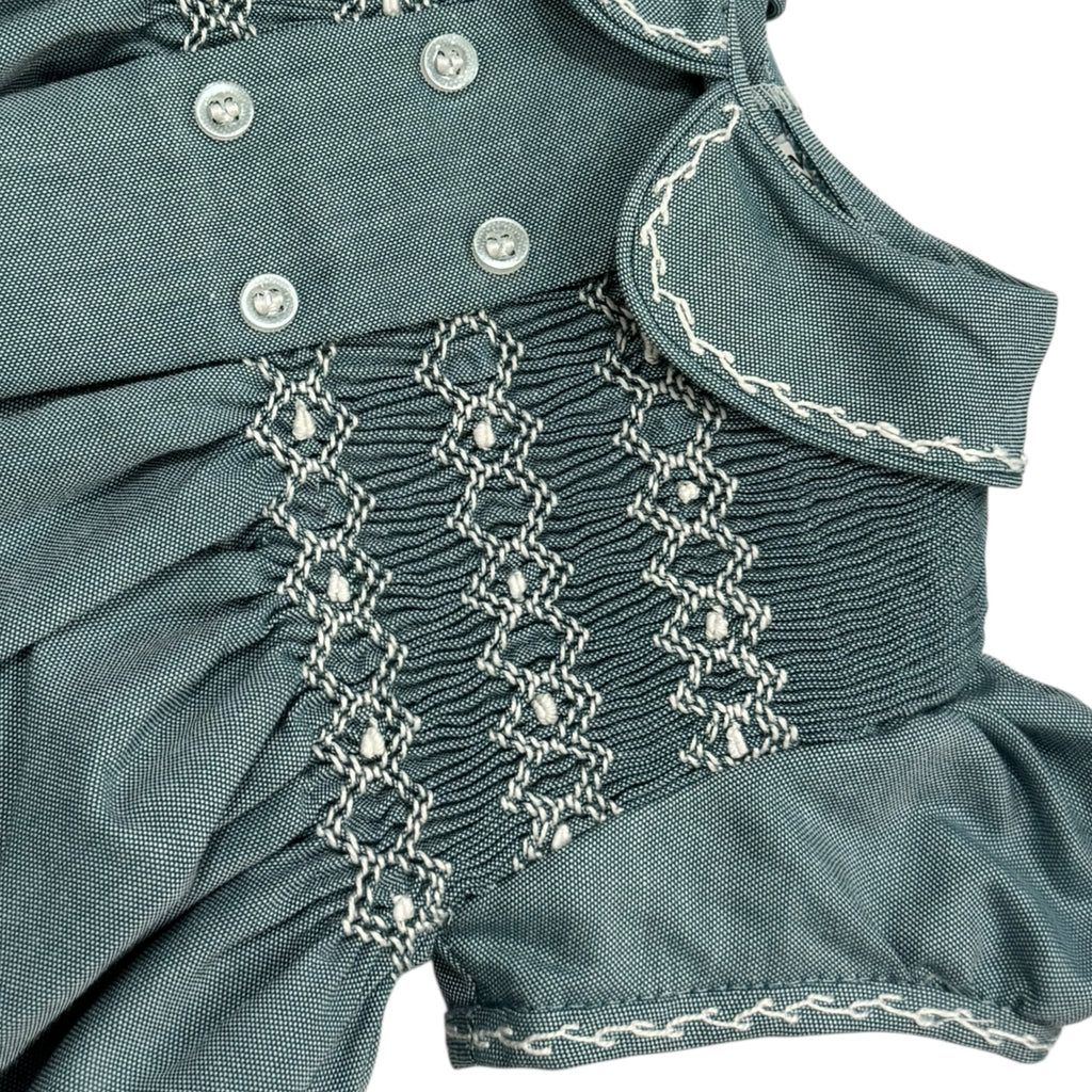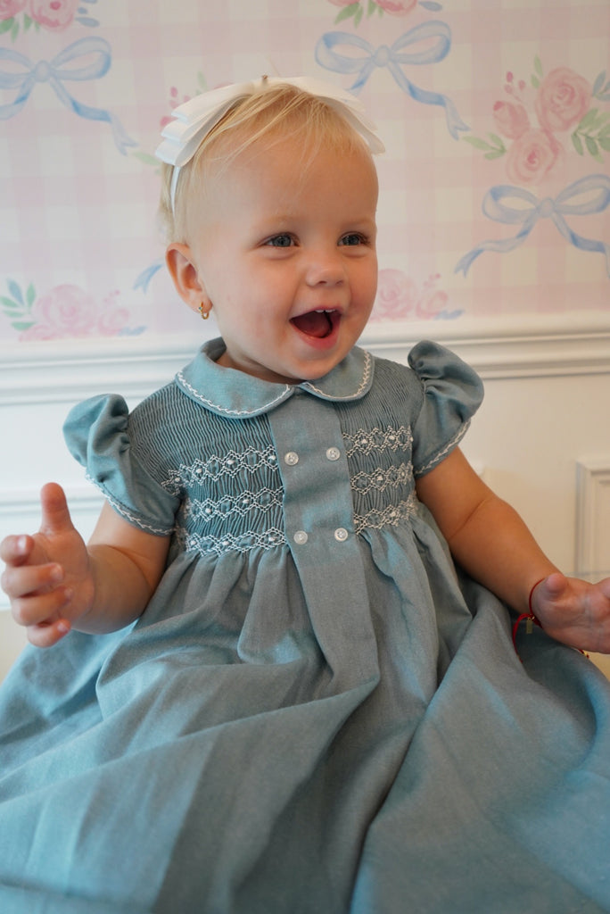 Beautiful handsmocked dress in a slate blue color with a peter pan collar and smocking in contrasting white.