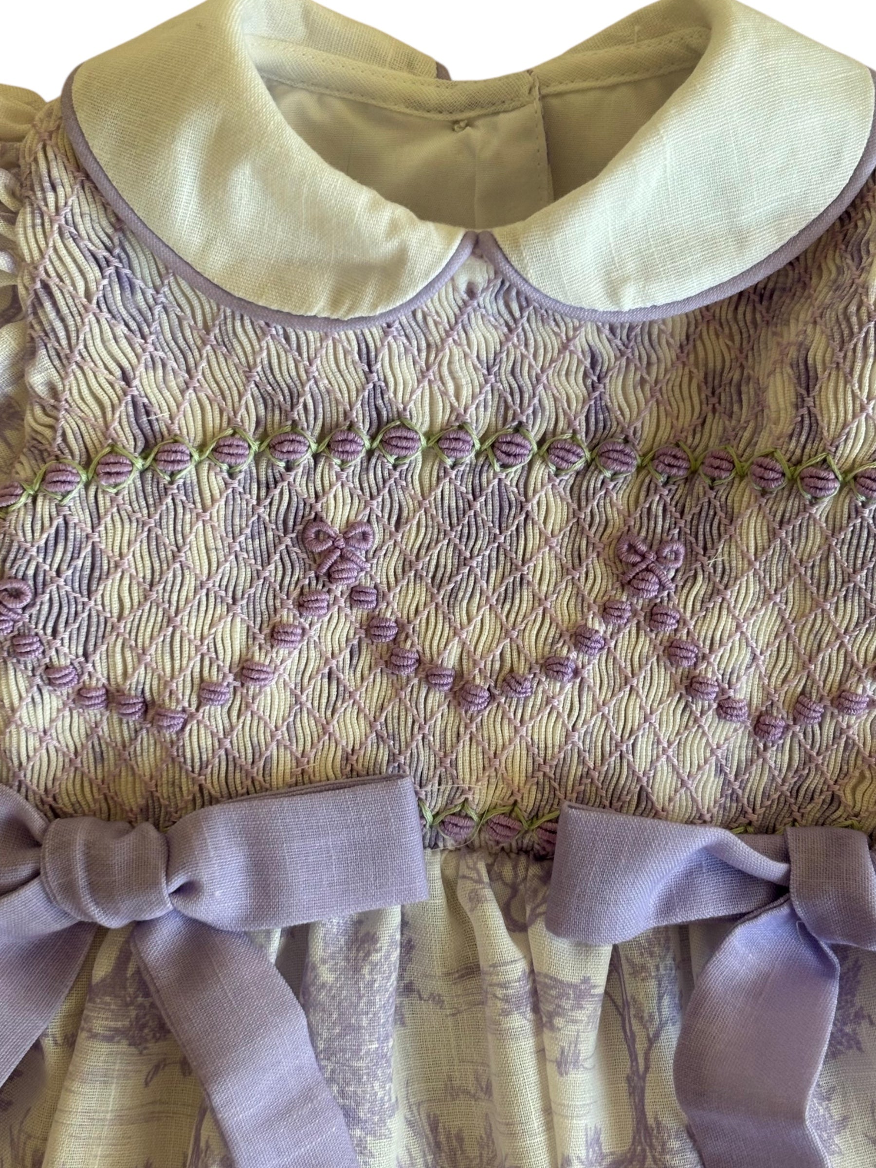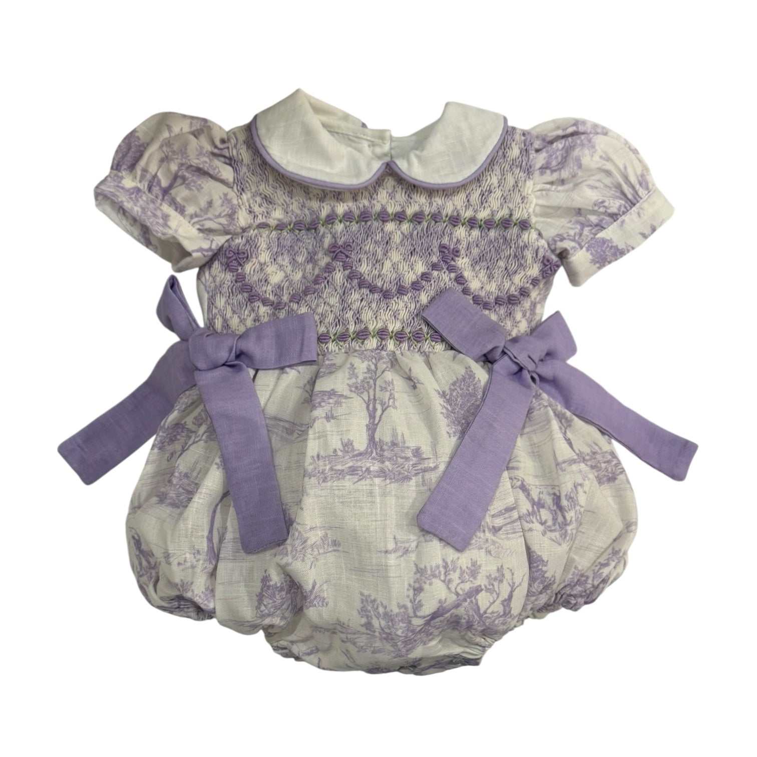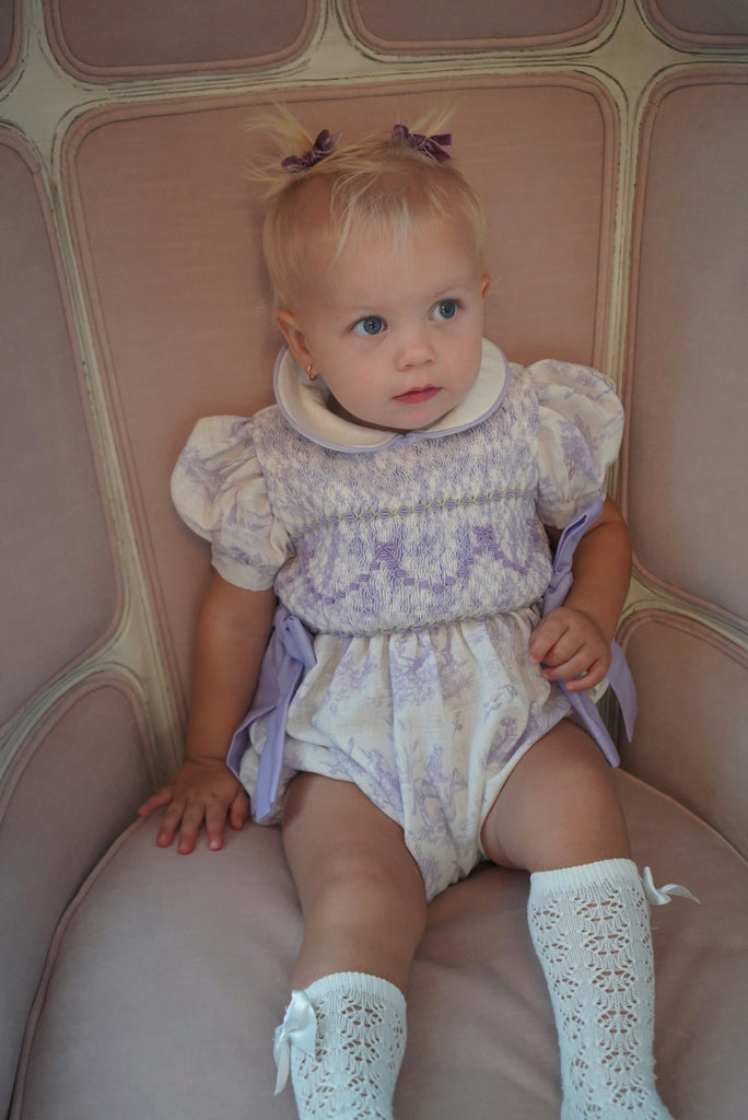 PREORDER Claudia Bows Toile de Jouy Lilac Handsmocked Romper (Ships January 2026)