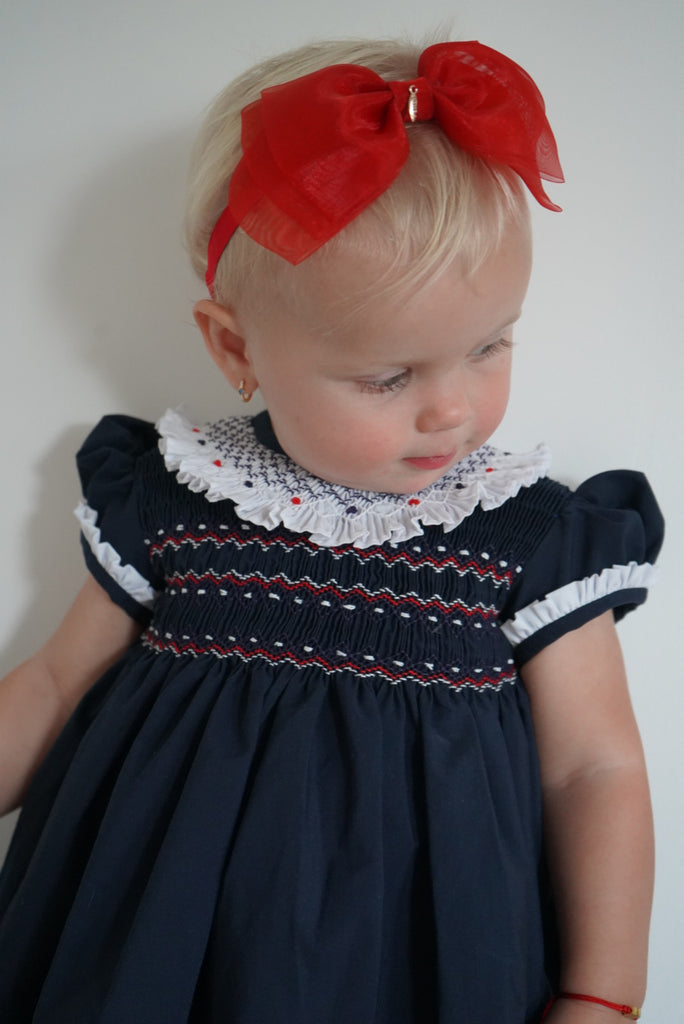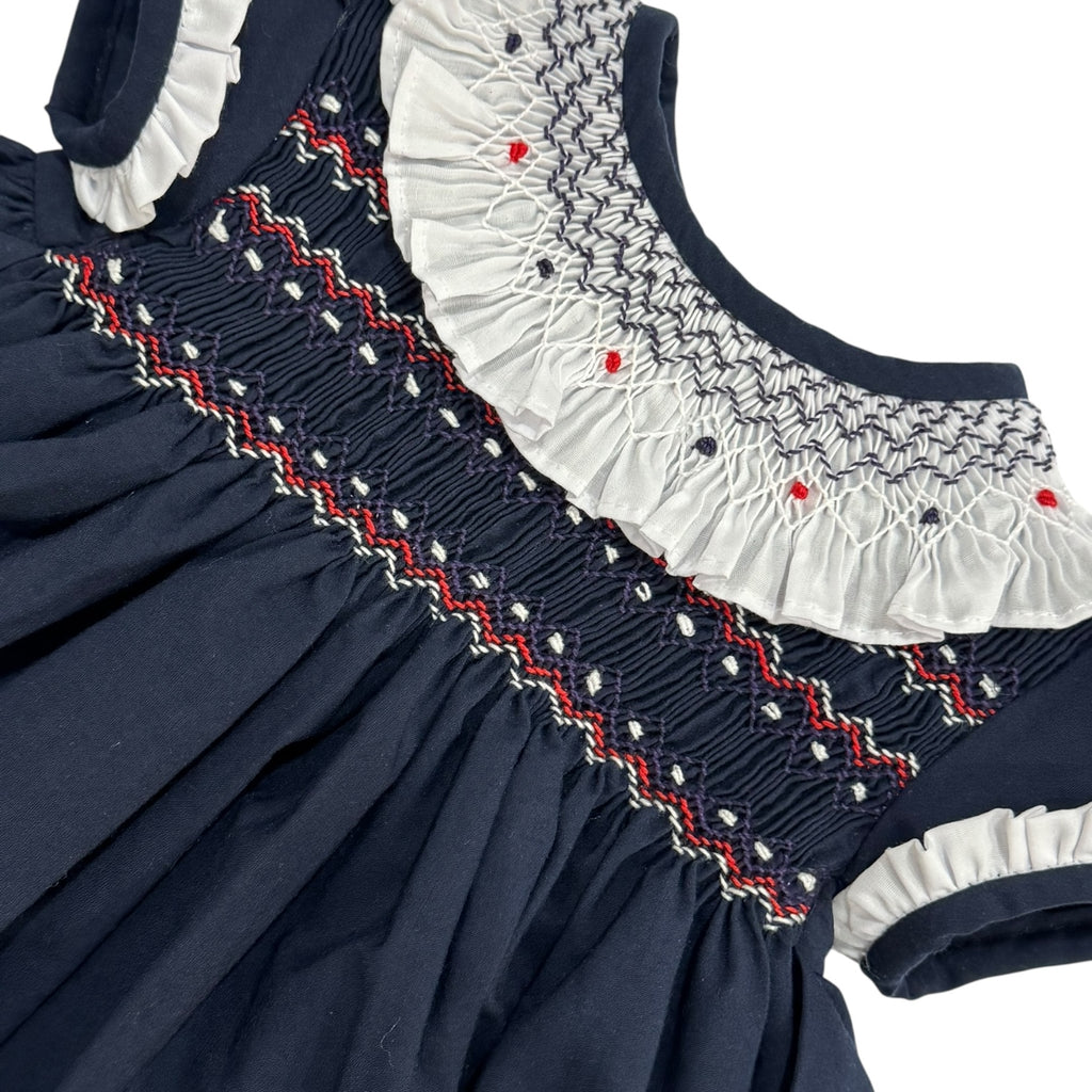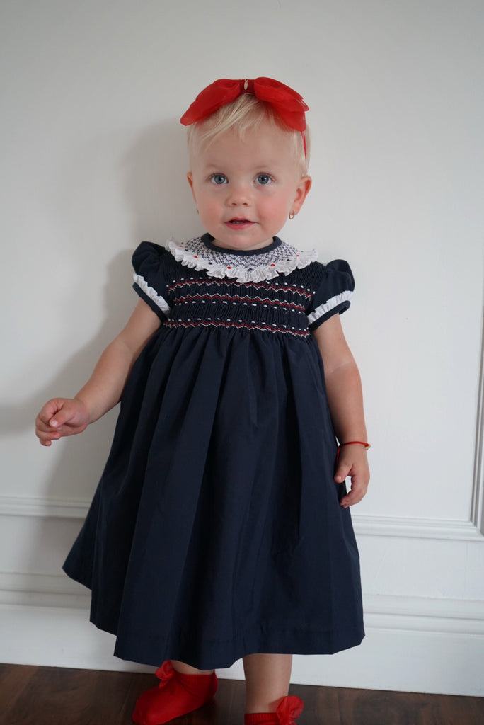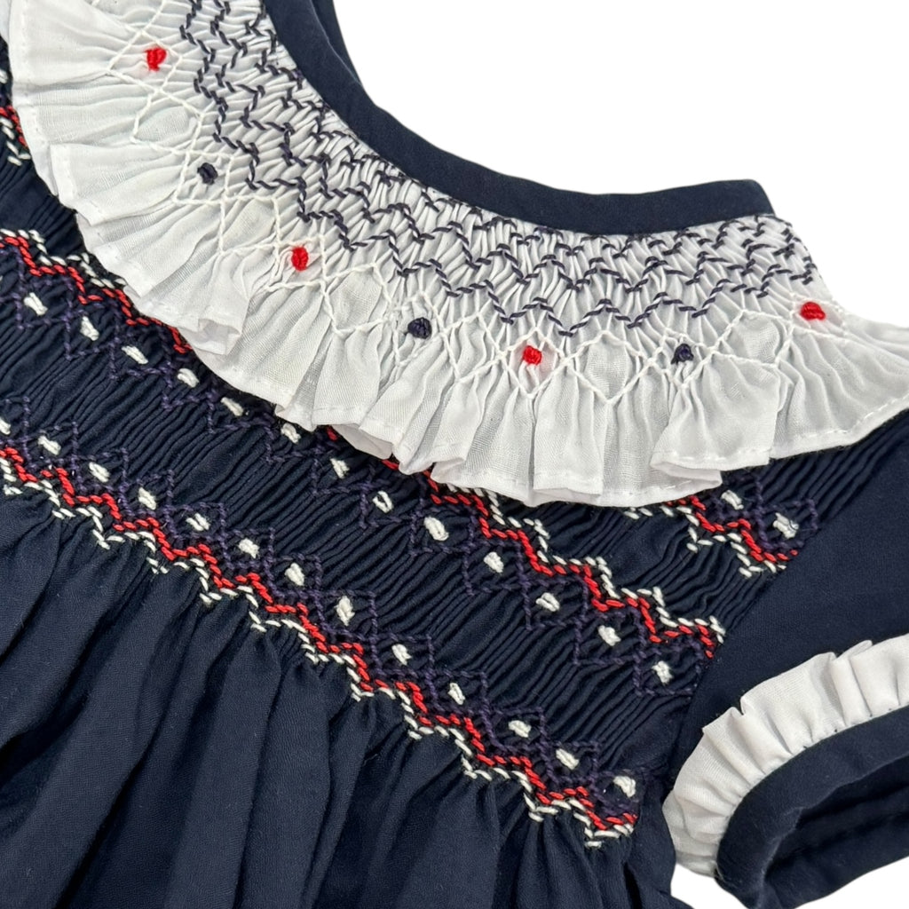 Precious dress crafted in a navy blue fabric with intricate smocking on the collar and bodice.