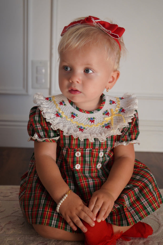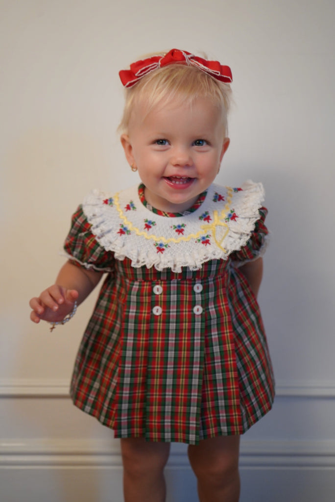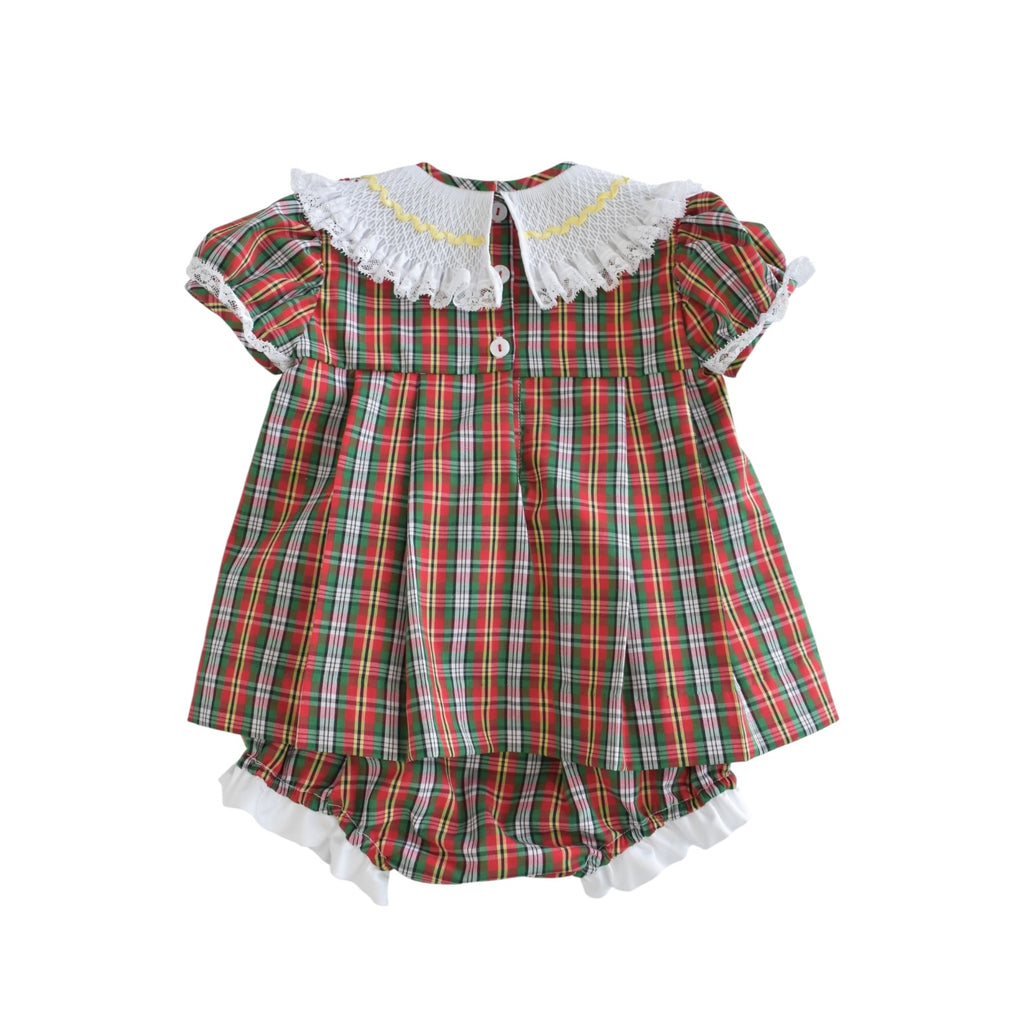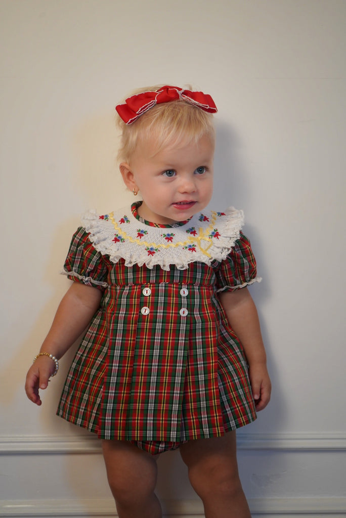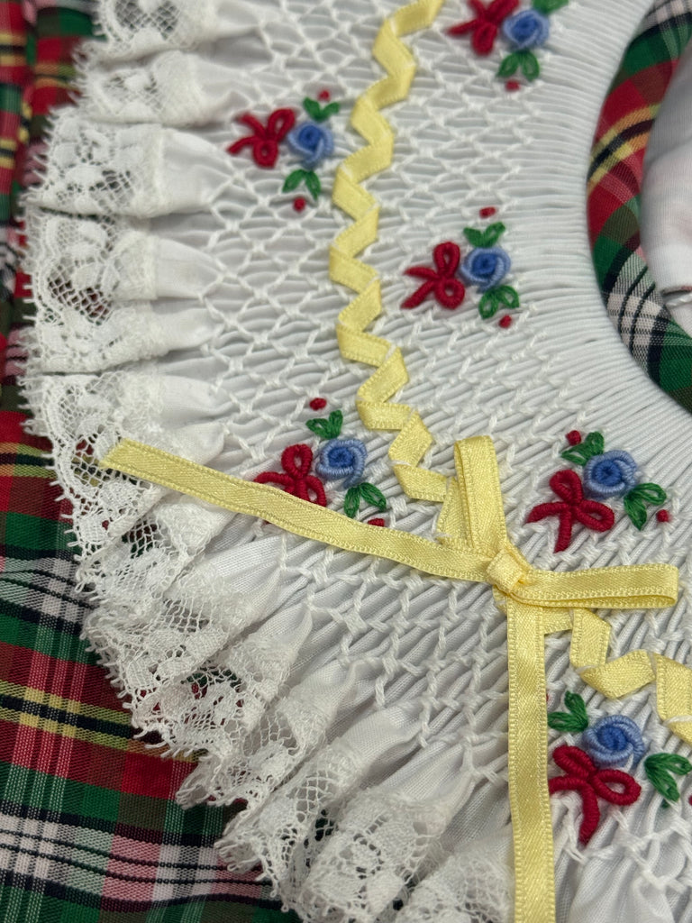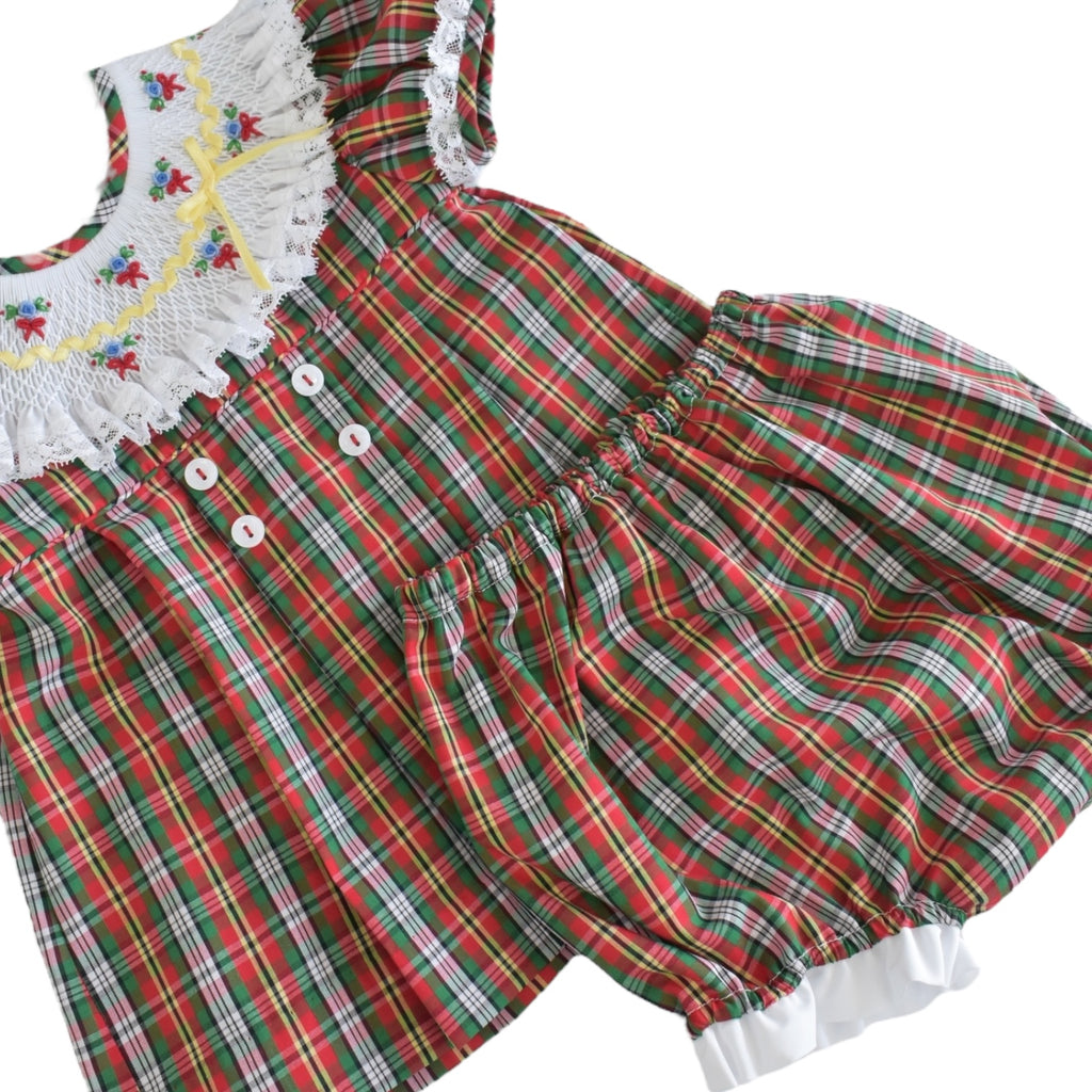 A timeless green tartan set with bloomers, elevated with exquisite handsmocking along the neckline for a truly elegant touch. The intricate design features delicately handsmocked bows, accentuated with a contrasting yellow ribbon that adds just the right pop of color.