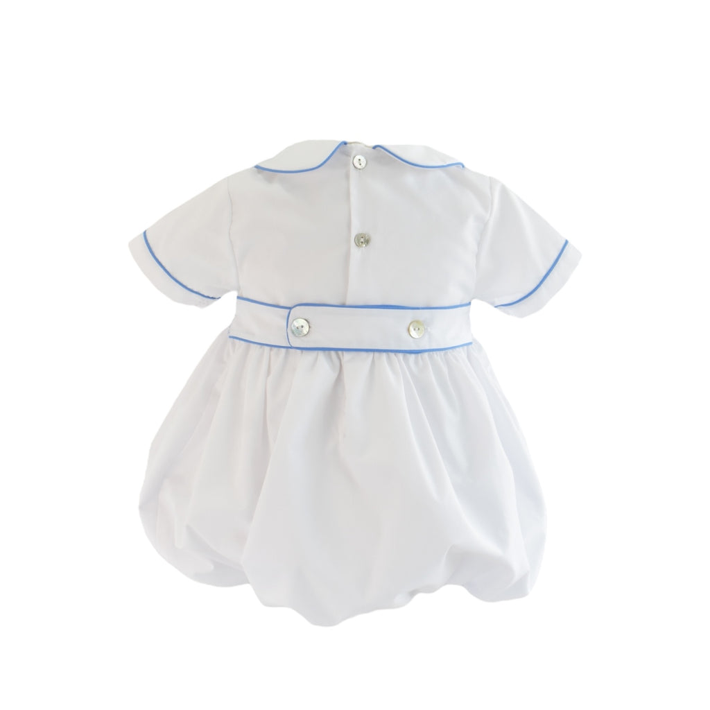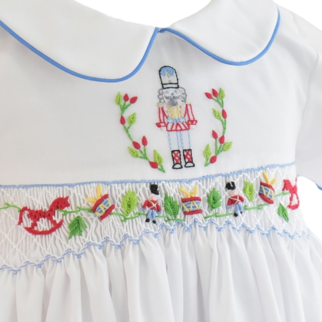 This precious Sugarplum Handsmocked bubble/romper set is a true heirloom piece for boys. Lovingly crafted for the most magical time of the year. The bodice features hansmocking, carefully stitched to perfection, and adorned with a nutcracker motif embroidered with precious, intricate details.