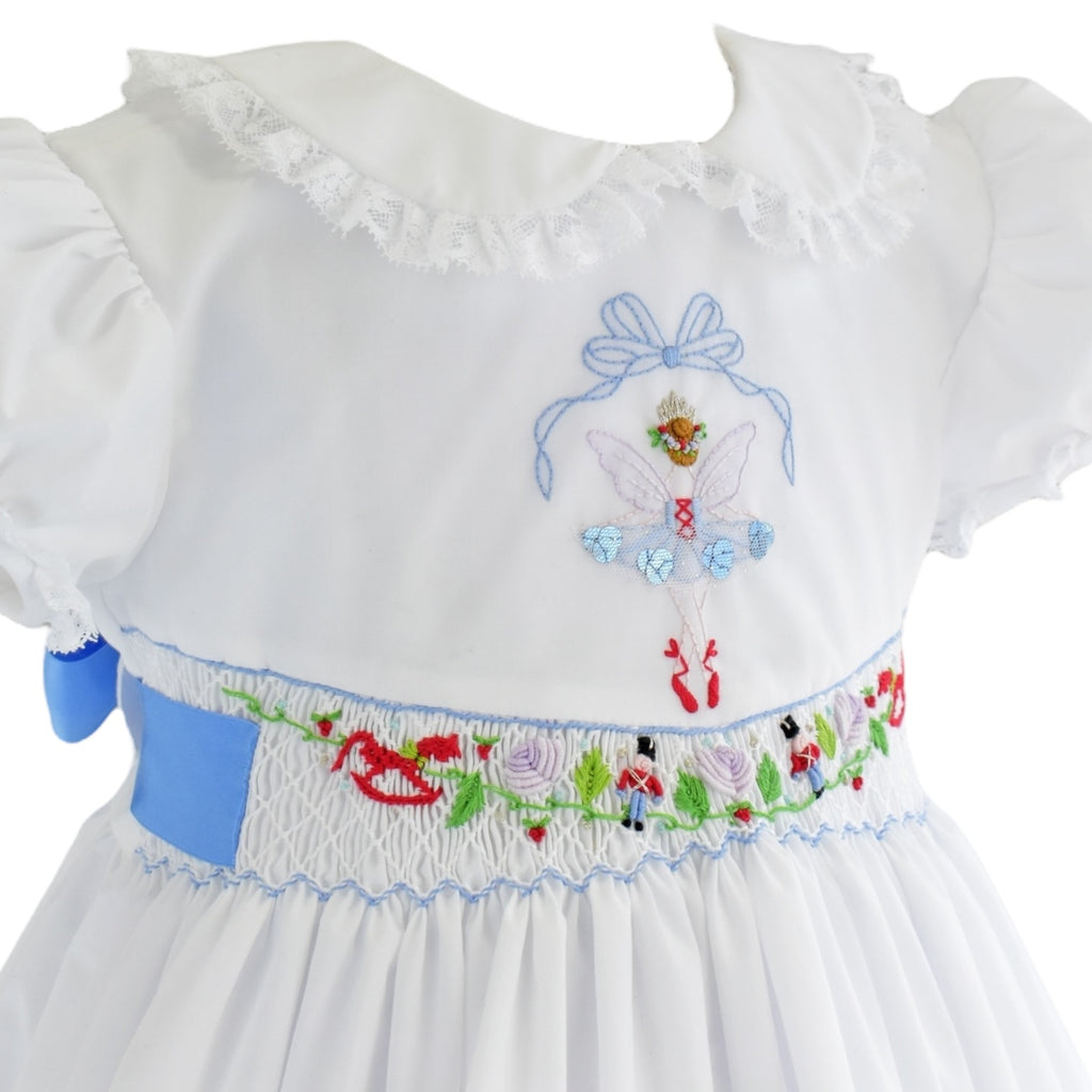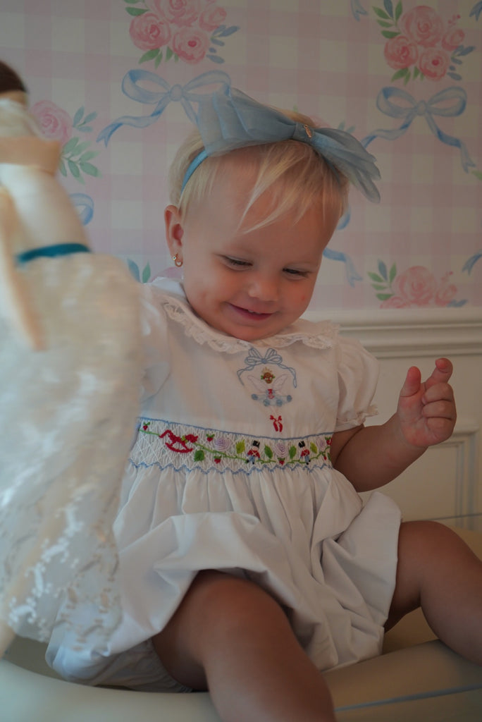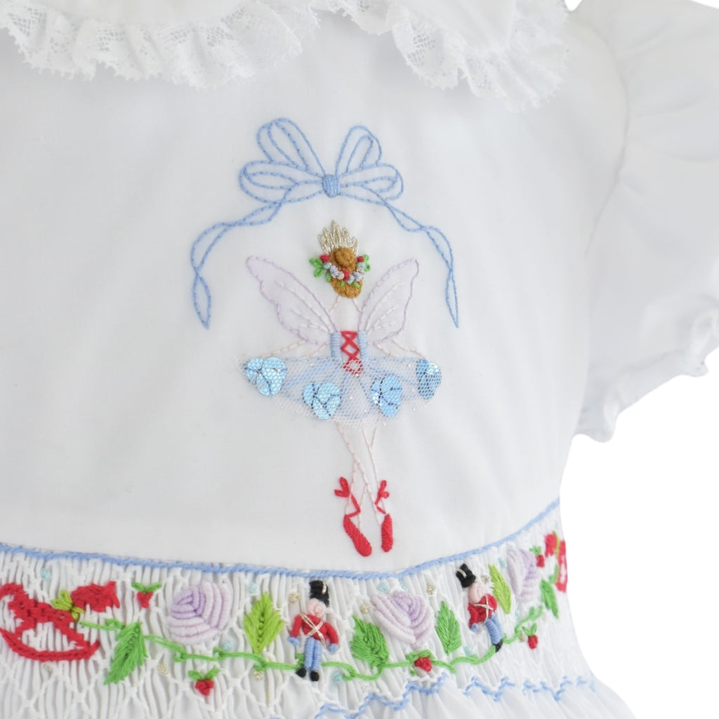 This Sugarplum Handsmocked Girl Romper/Bubble is a true heirloom piece, lovingly crafted for the most magical time of the year. The bodice features exquisite hand-smocking, carefully stitched to perfection, and adorned with a delicate ballerina motif embroidered with precious, intricate details that bring the dress to life. At the back, a luxurious blue ribbon ties into a perfect bow, adding an extra touch of elegance and charm.