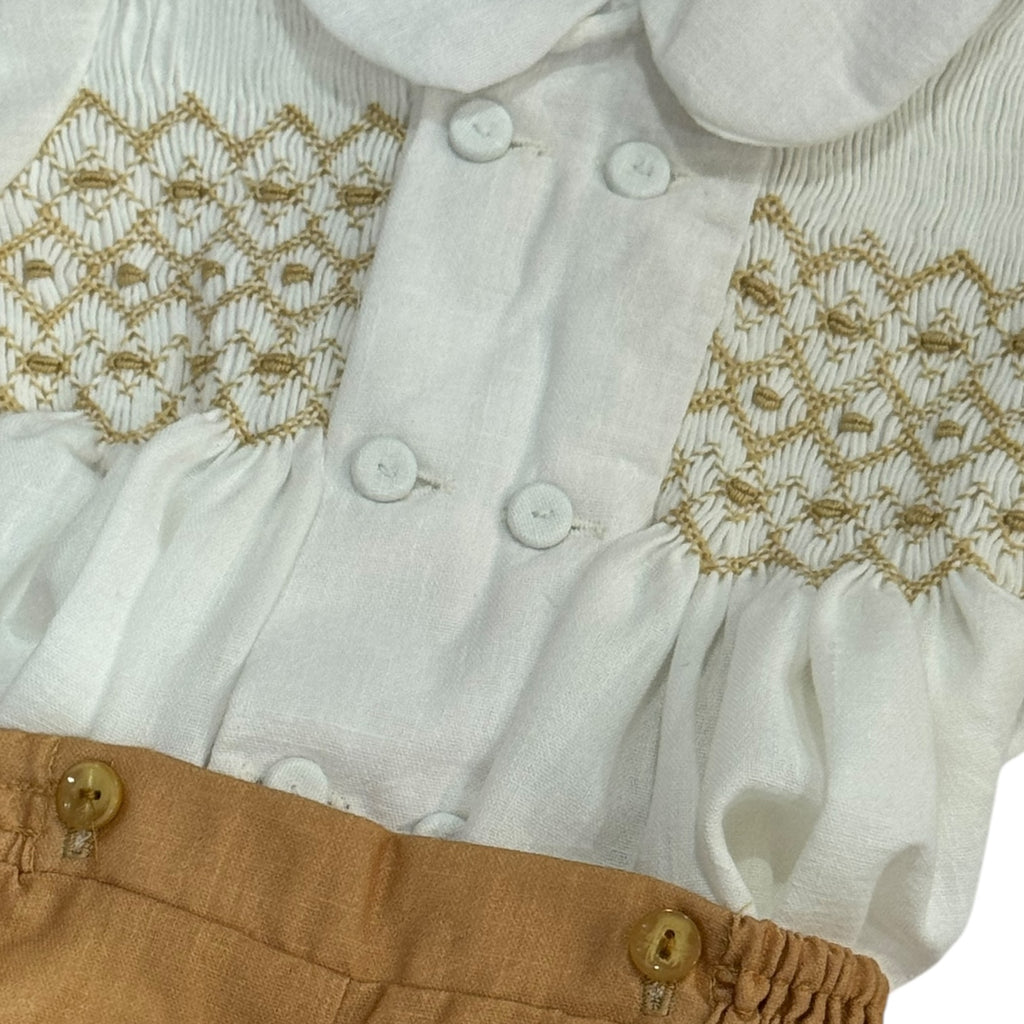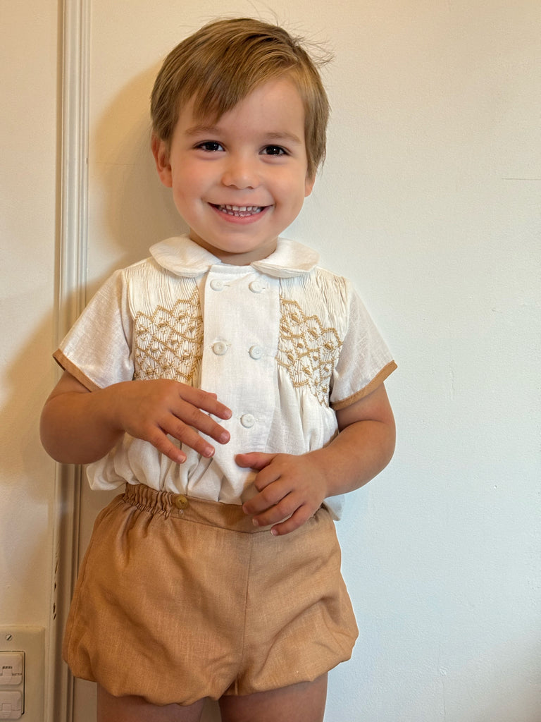 Literally the most stunning boy set we sell- a beautifully exclusive two-piece set. This set features a stunning handsmocked off-white linen shirt paired with beautiful camel linen shorts. Handcrafted with care and attention to detail, it is perfect for dressing your little prince in regal style.