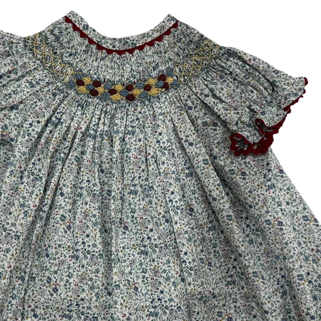 Beautiful blue floral dress with handsmocked roses in comtrasting burgundy, blue and yellow colors, crafted in a floral cotton fabric.