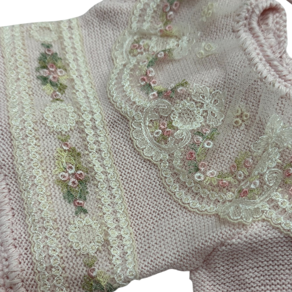 New color of our best seller Aida set now in all pink floral accents/lace. It is a super delicate and different option for a newborn knitted set. Matching blanket available search for “Aida”.