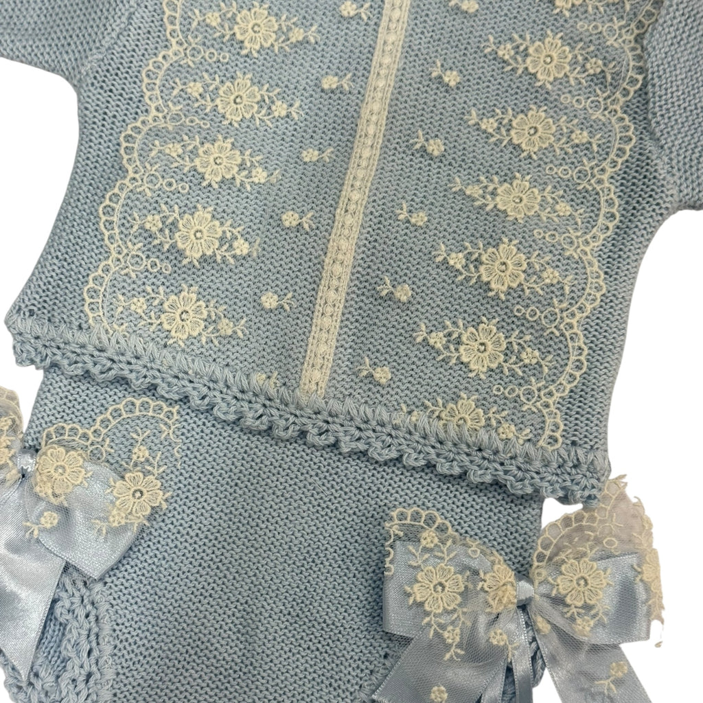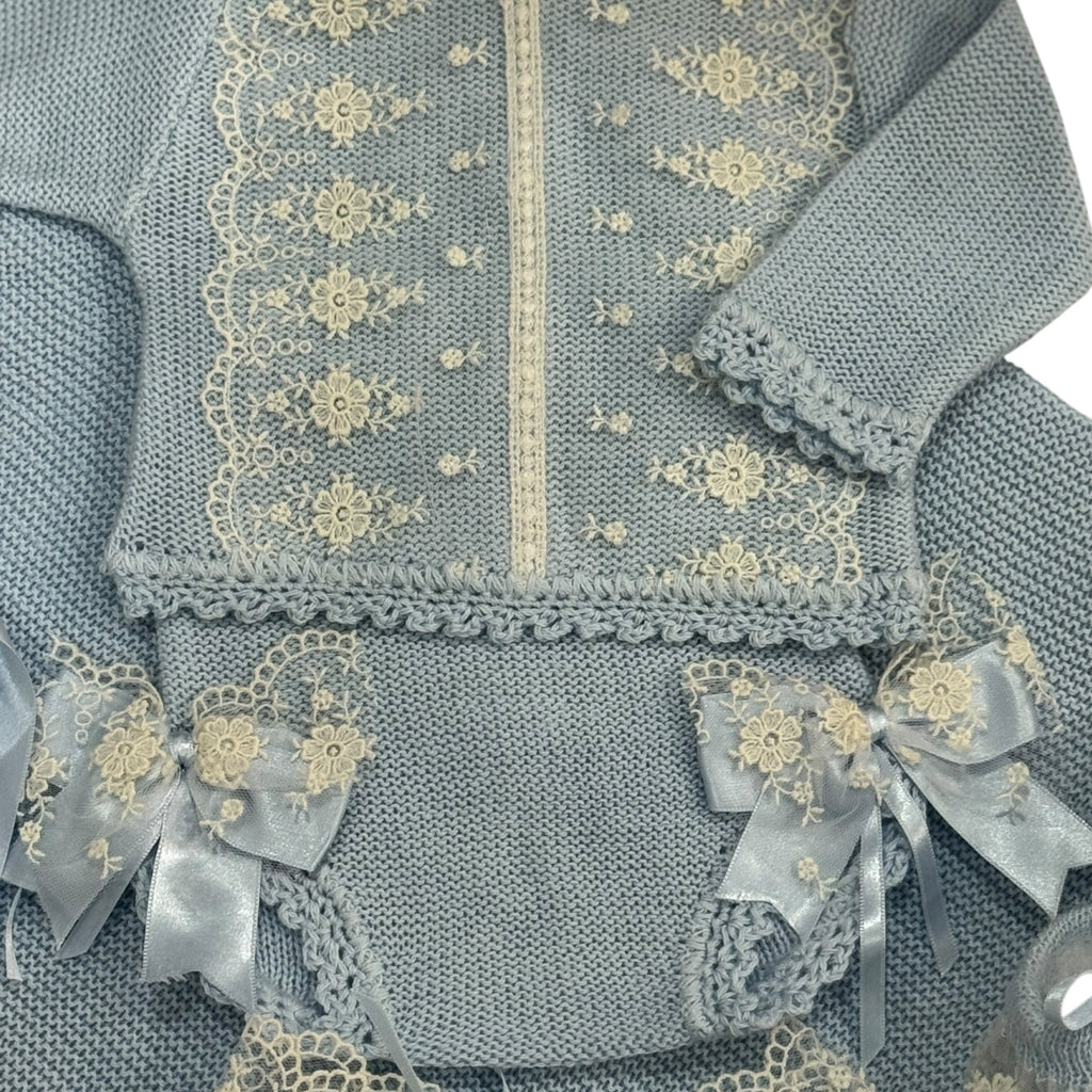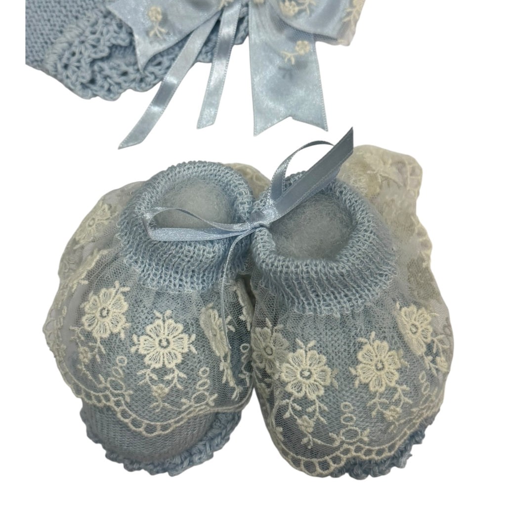 Exquisite 4-piece set in light blue, with a gorgeous floral lace details in ivory. Match with our Arianna Light blue knitted blanket
