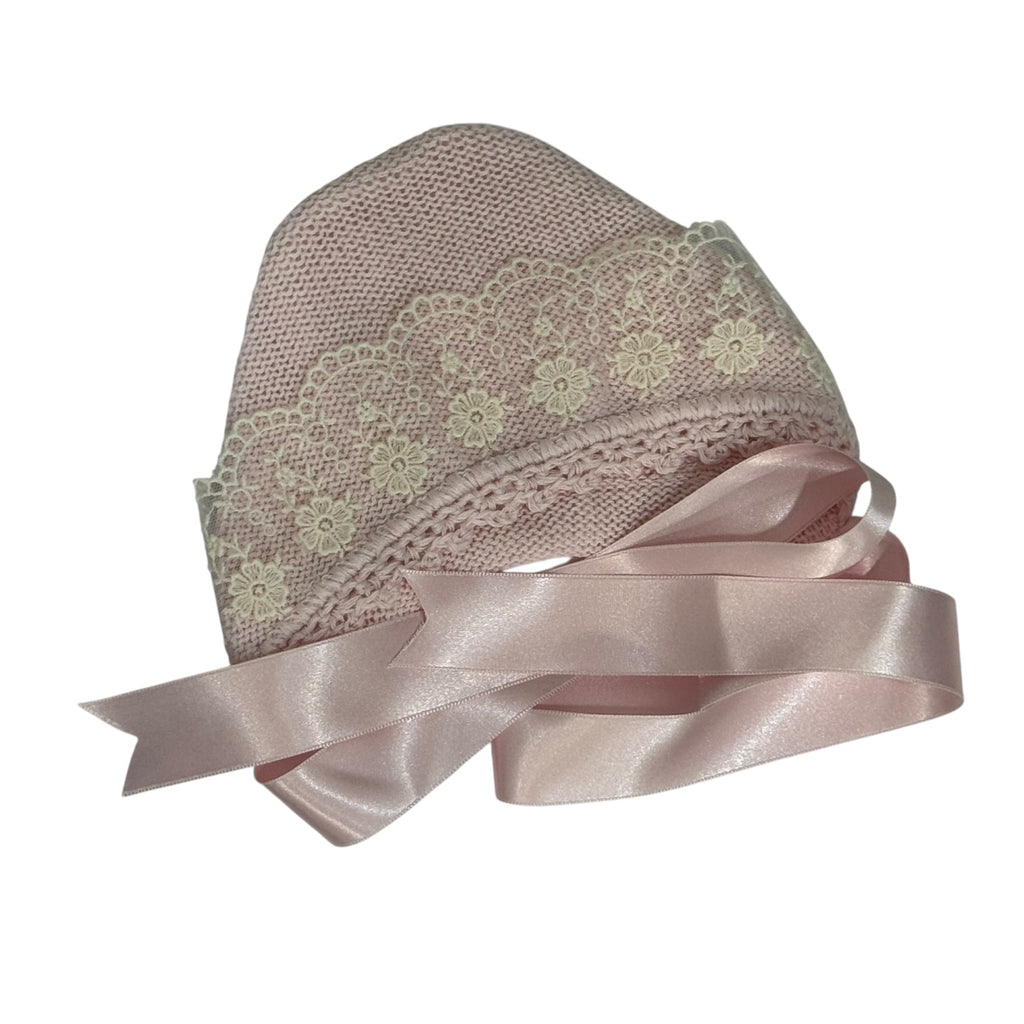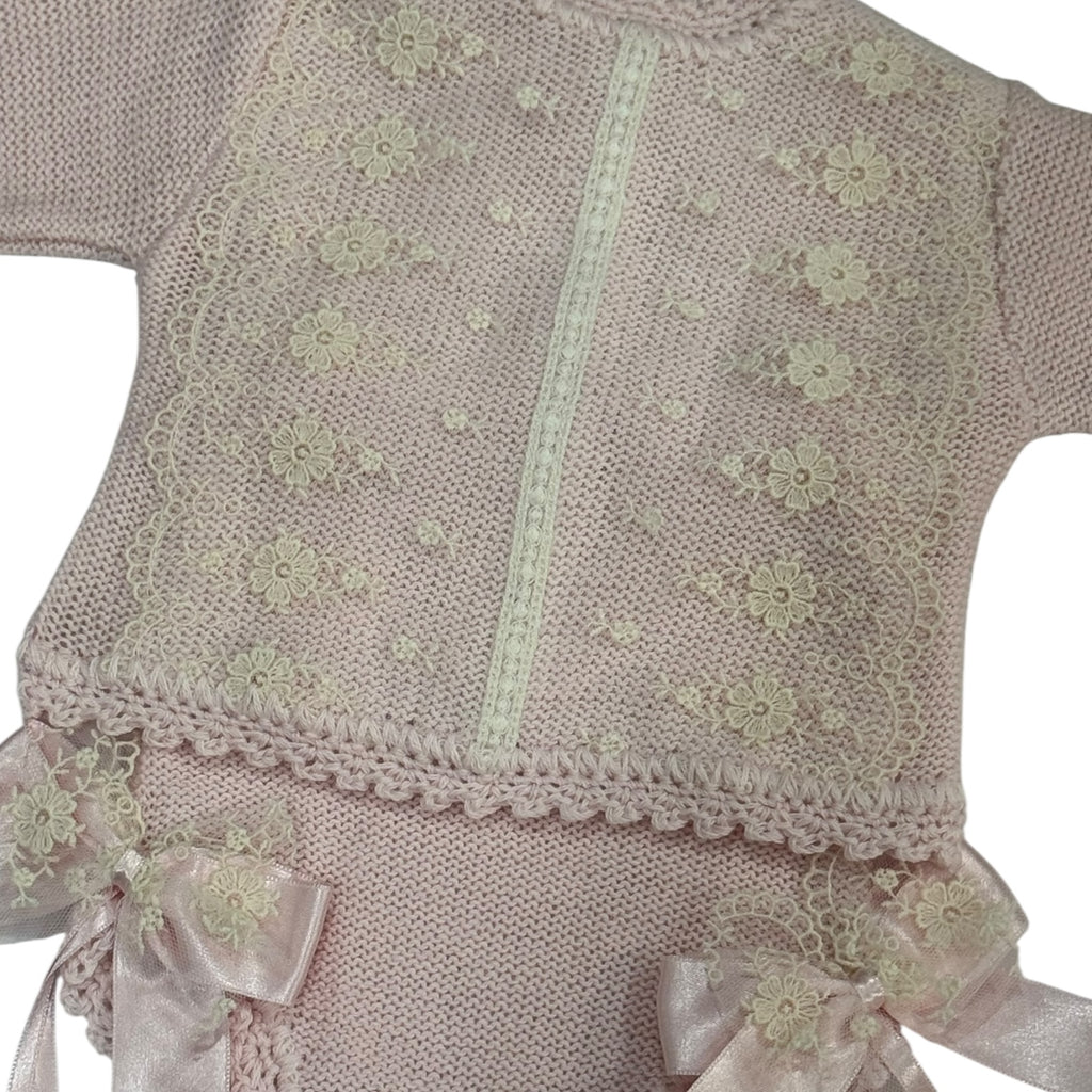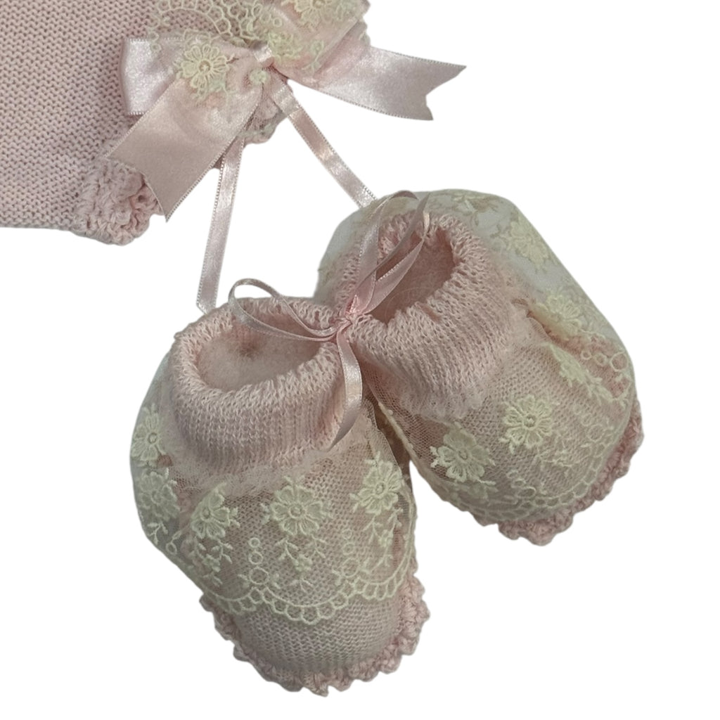 Exquisite 4-piece set in light pink, with a gorgeous floral lace details in ivory. Match with our Arianna Light Pink knitted blanket