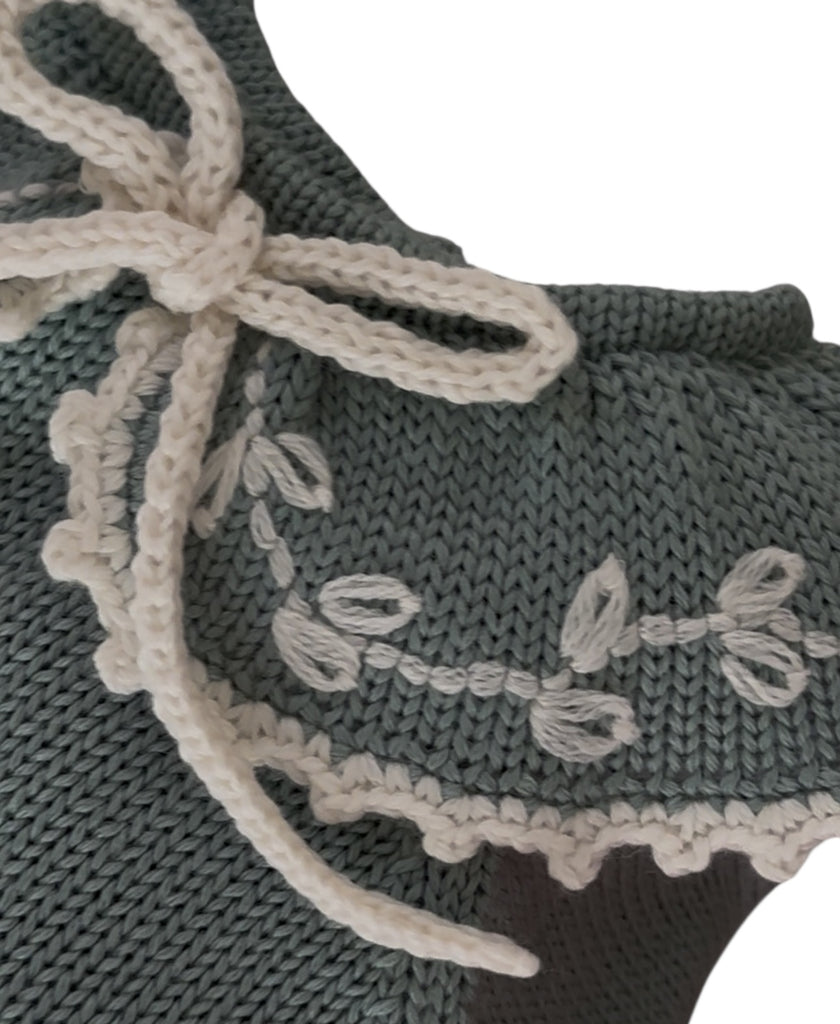 Super sweet knitted romper in a sage green color with hand embroidered white details in the collar.