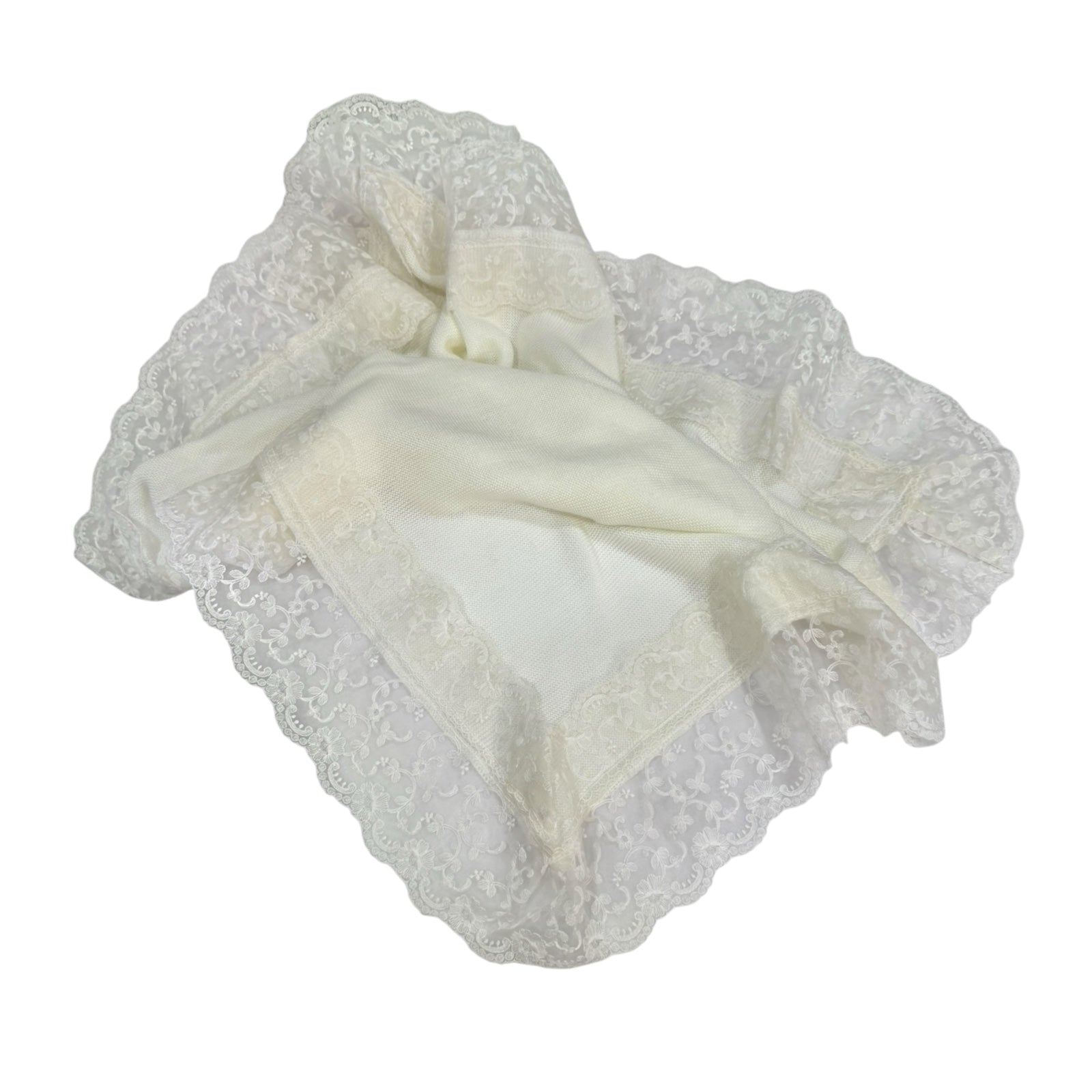 Stunning ivory blanket boasting a beautiful ivory lace and organza trim on the borders. Perfectly pairing with the Briggita knitted set, this luxurious ensemble makes a great gift for any special event, great for that first newborn photoshoot, or hospital picture.