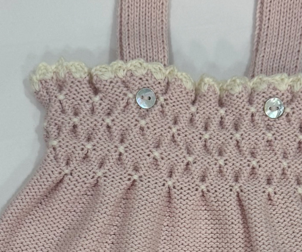 Super cute knitted romper for girls in a light pink color with beige in the borders