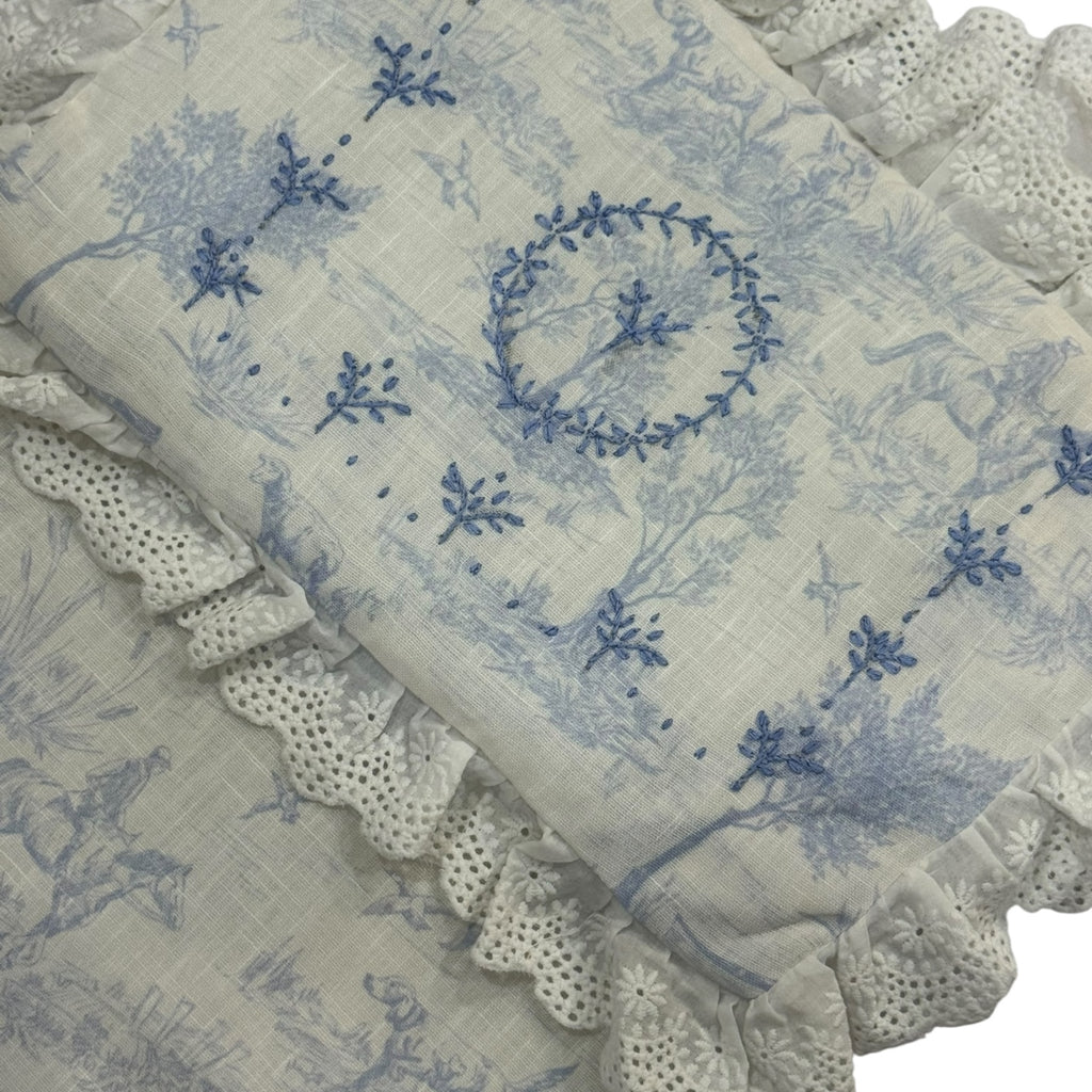 Stunning light blue 2-piece pad/liner with a matching pillow. Perfect for a small hospital crib or a bassinet. Its made with a lila Toile de Jouy fabric with handembroidered details.