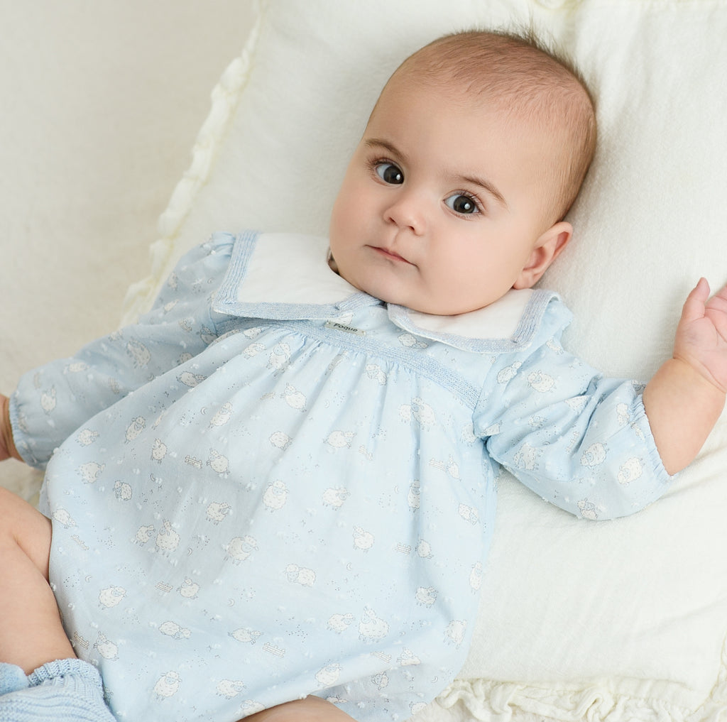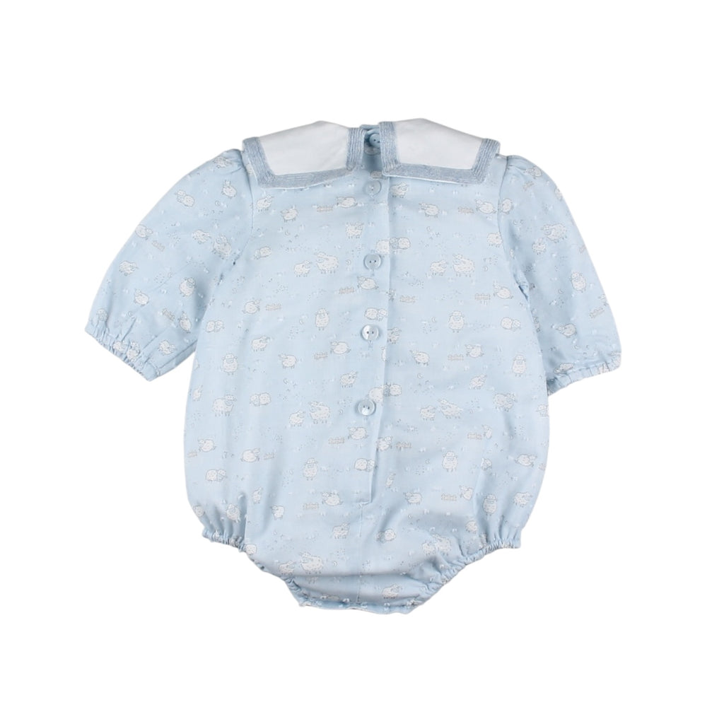 Ultra sweet romper for boys with little lambs/sheep on the fabric. Made of 100% cotton