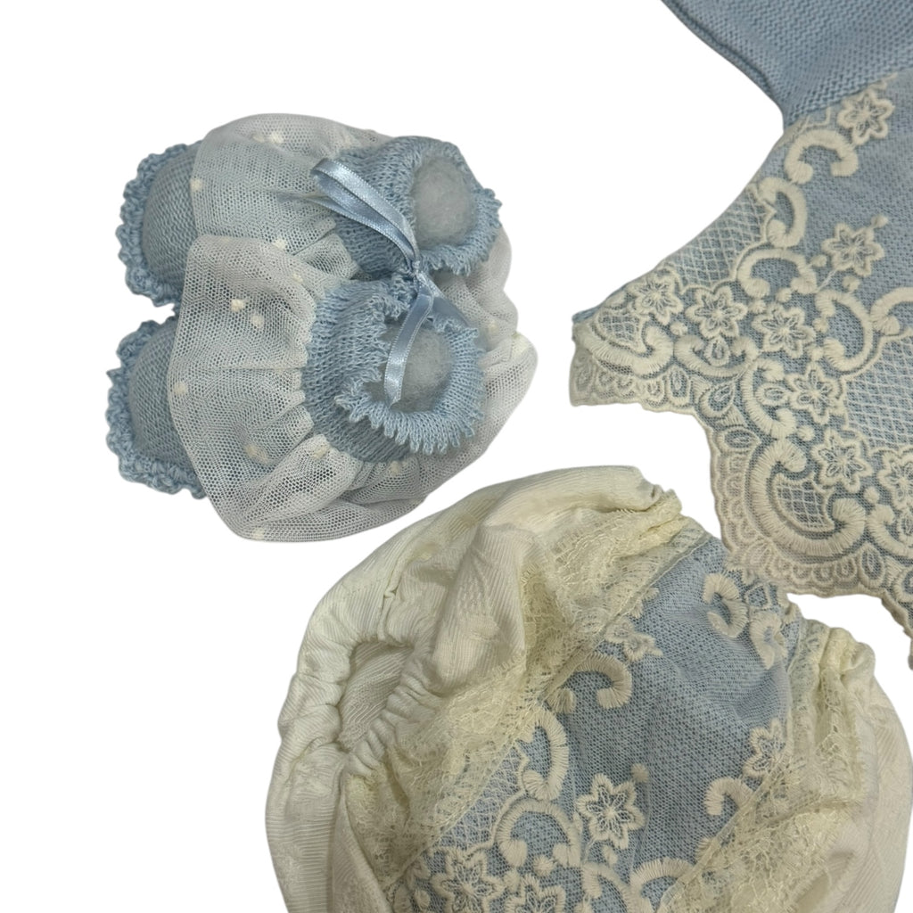 Exquisite 4-piece set in light blue, with gorgeous lace details in ivory. Match with our Roman Light Blue knitted blanket