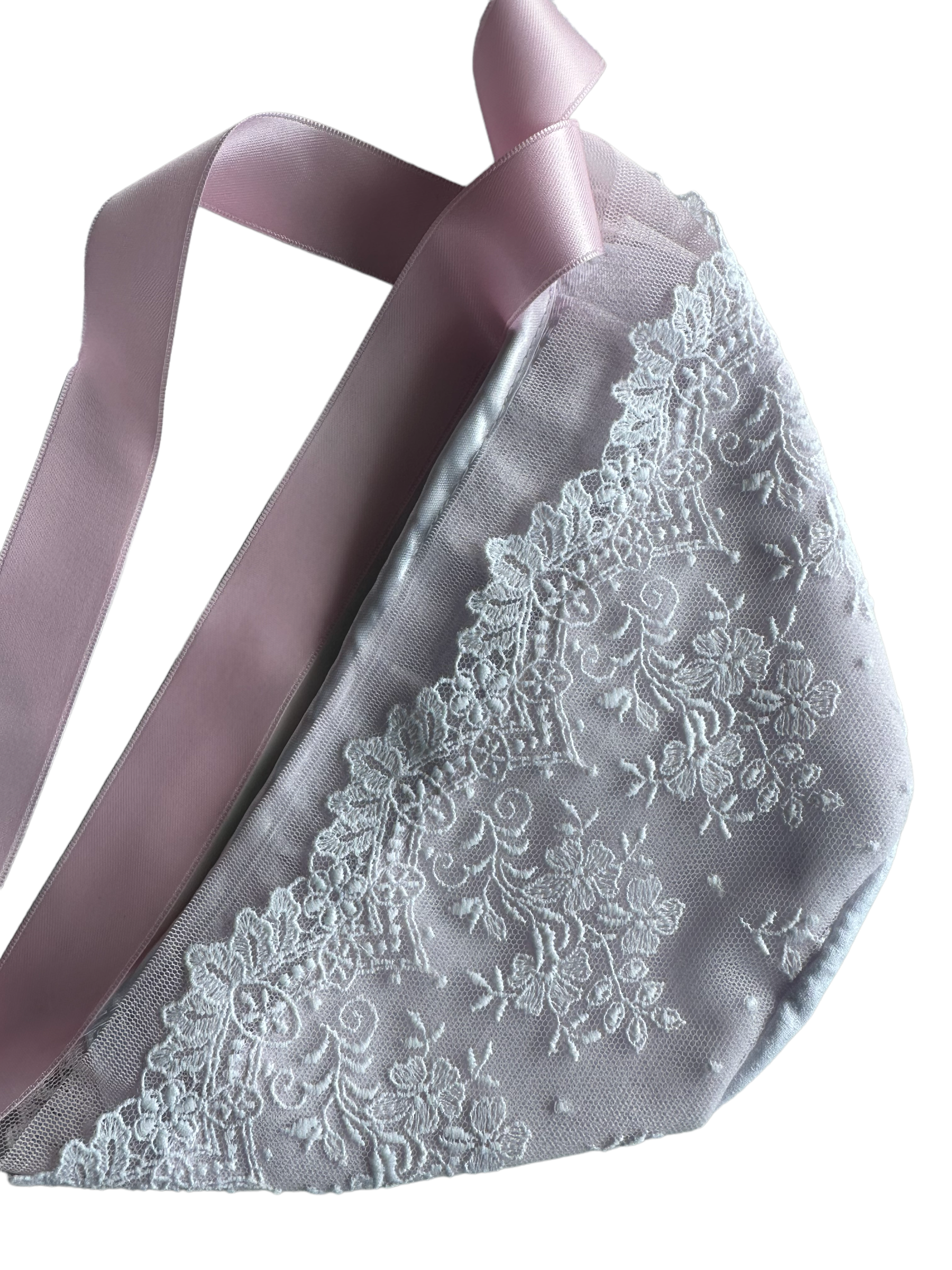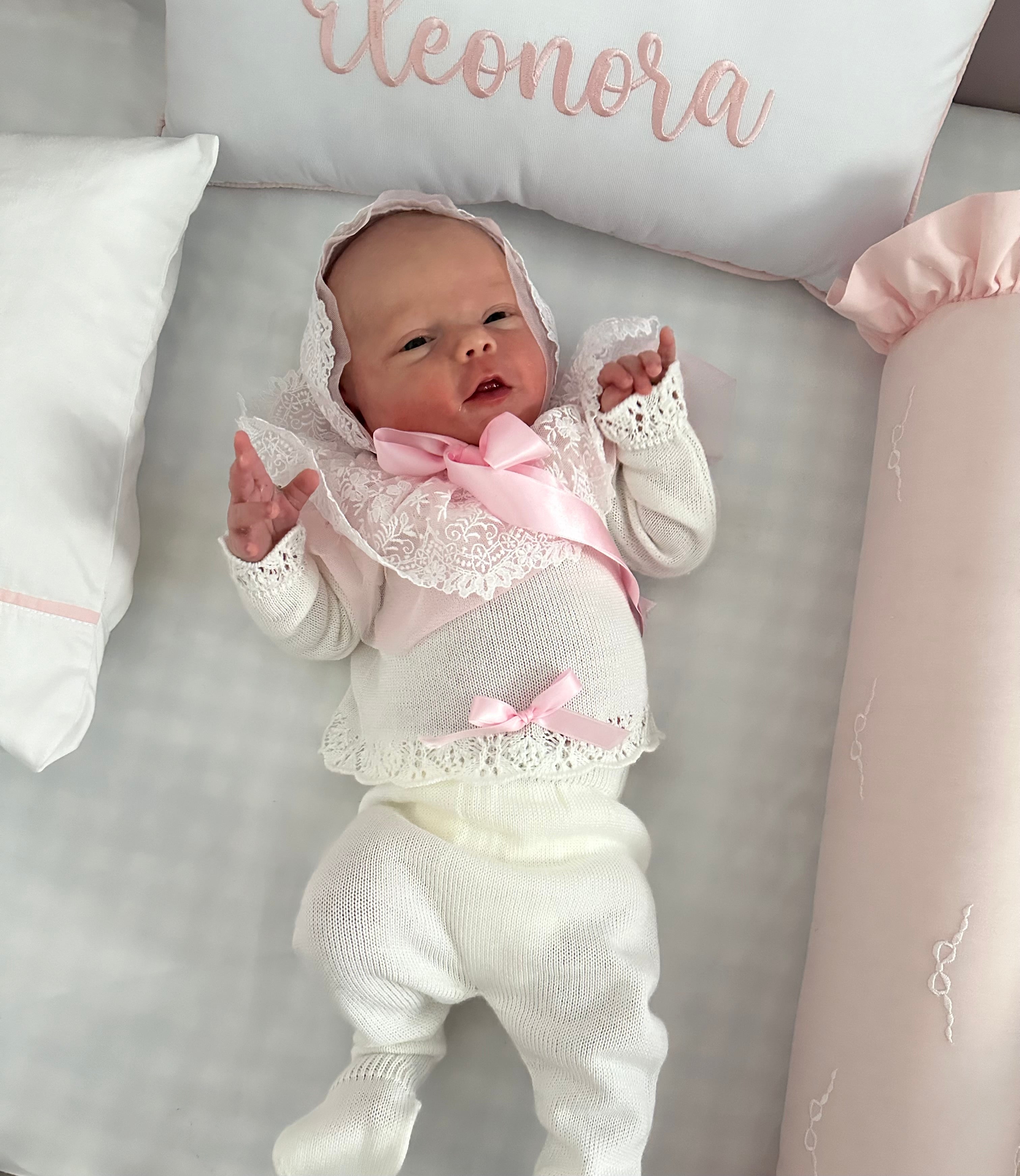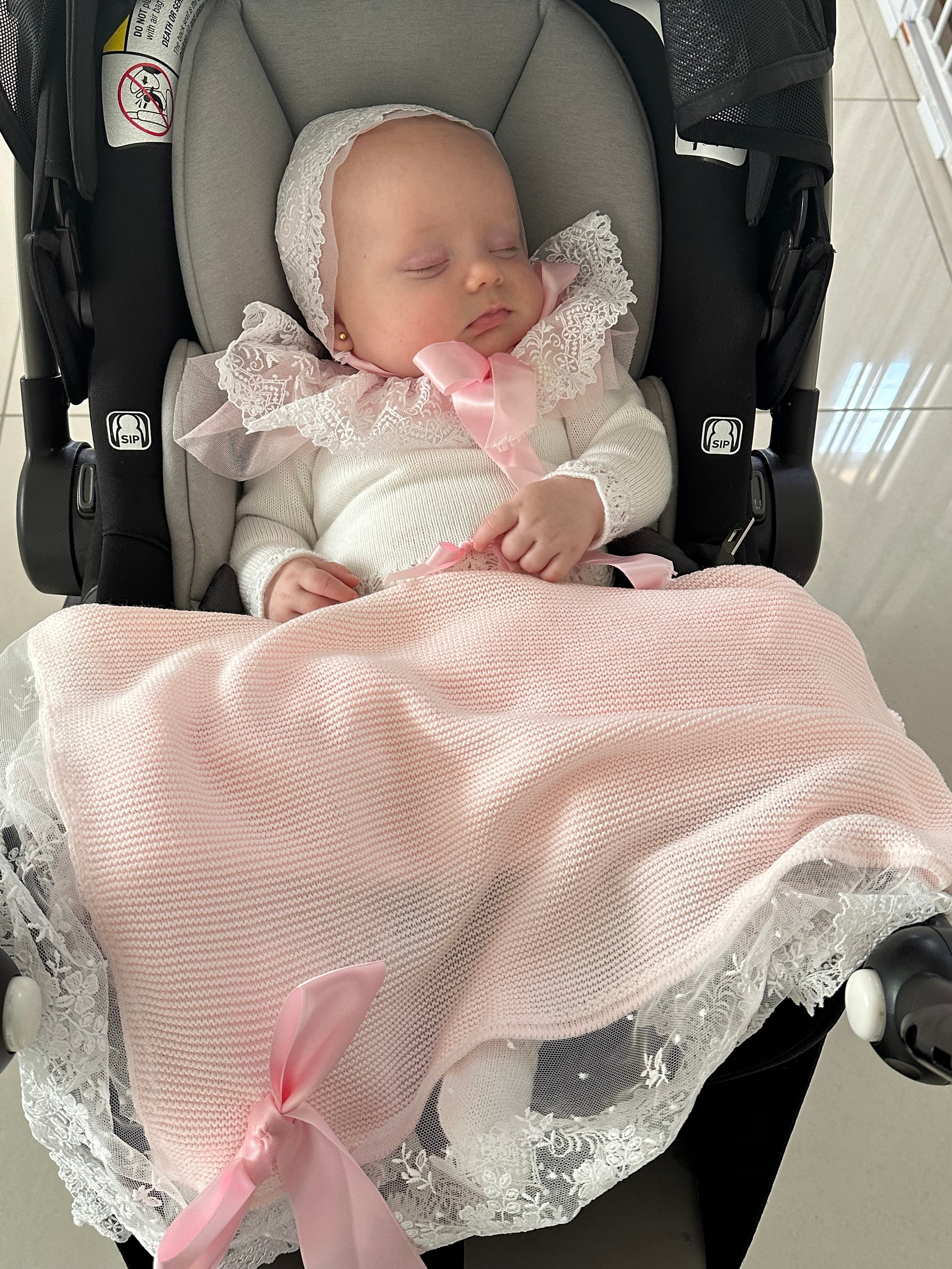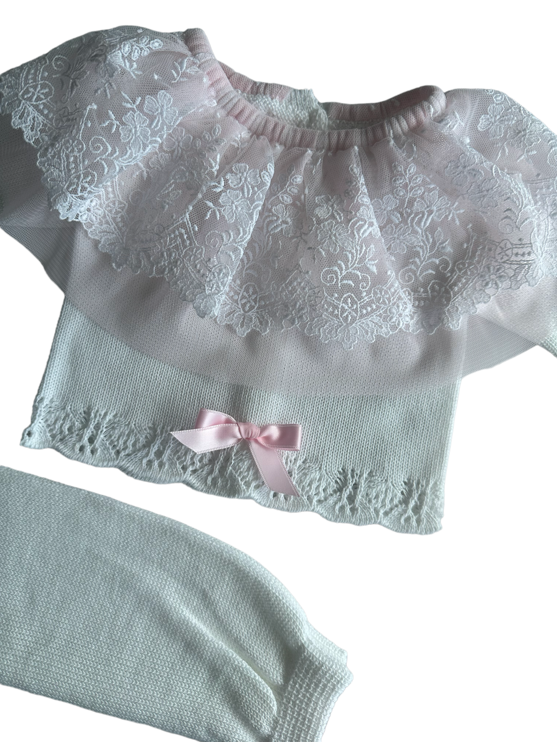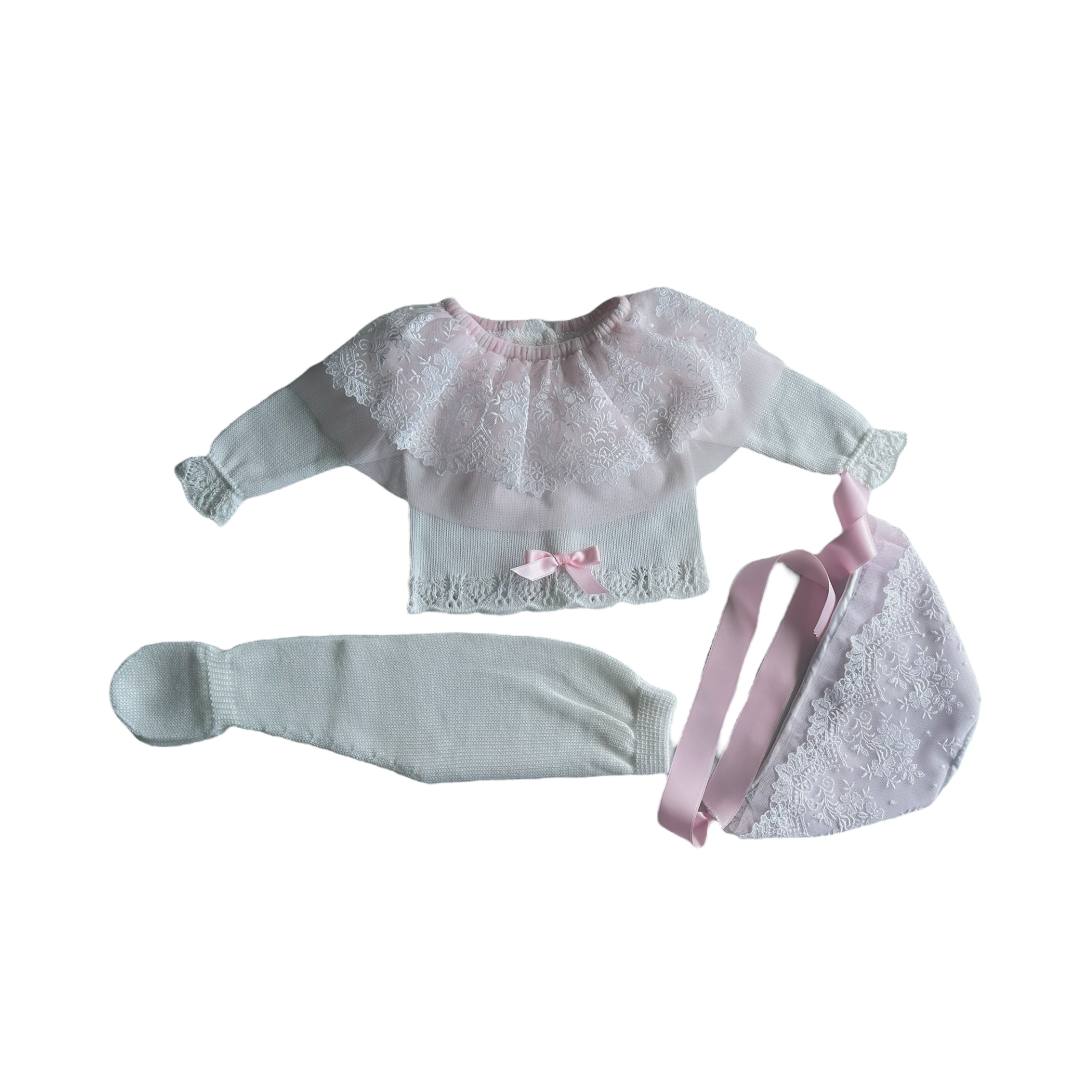 Beautiful 3-piece set in pure white with pink details and a gorgeous lace around the neckline and bonnet.