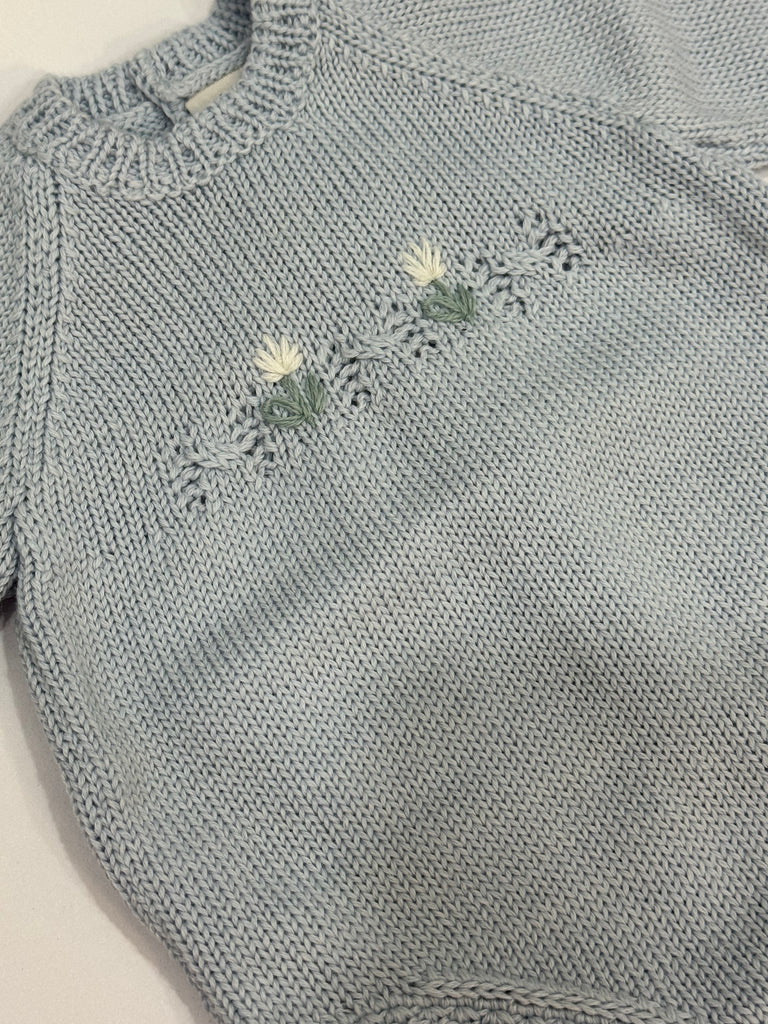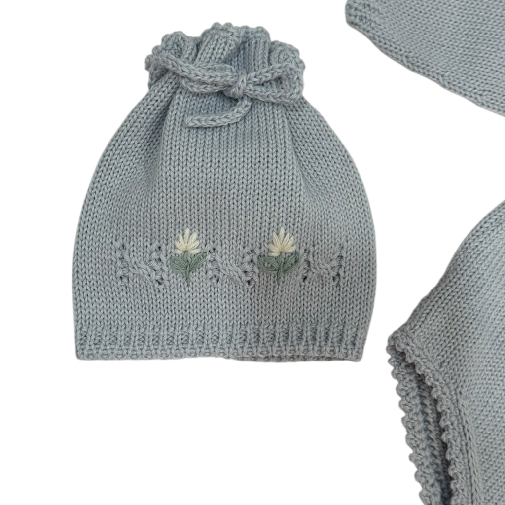 Super sweet knitted romper in a light blue color with hand embroidered white flowers in the center. It comes with matching hat with the same flowers