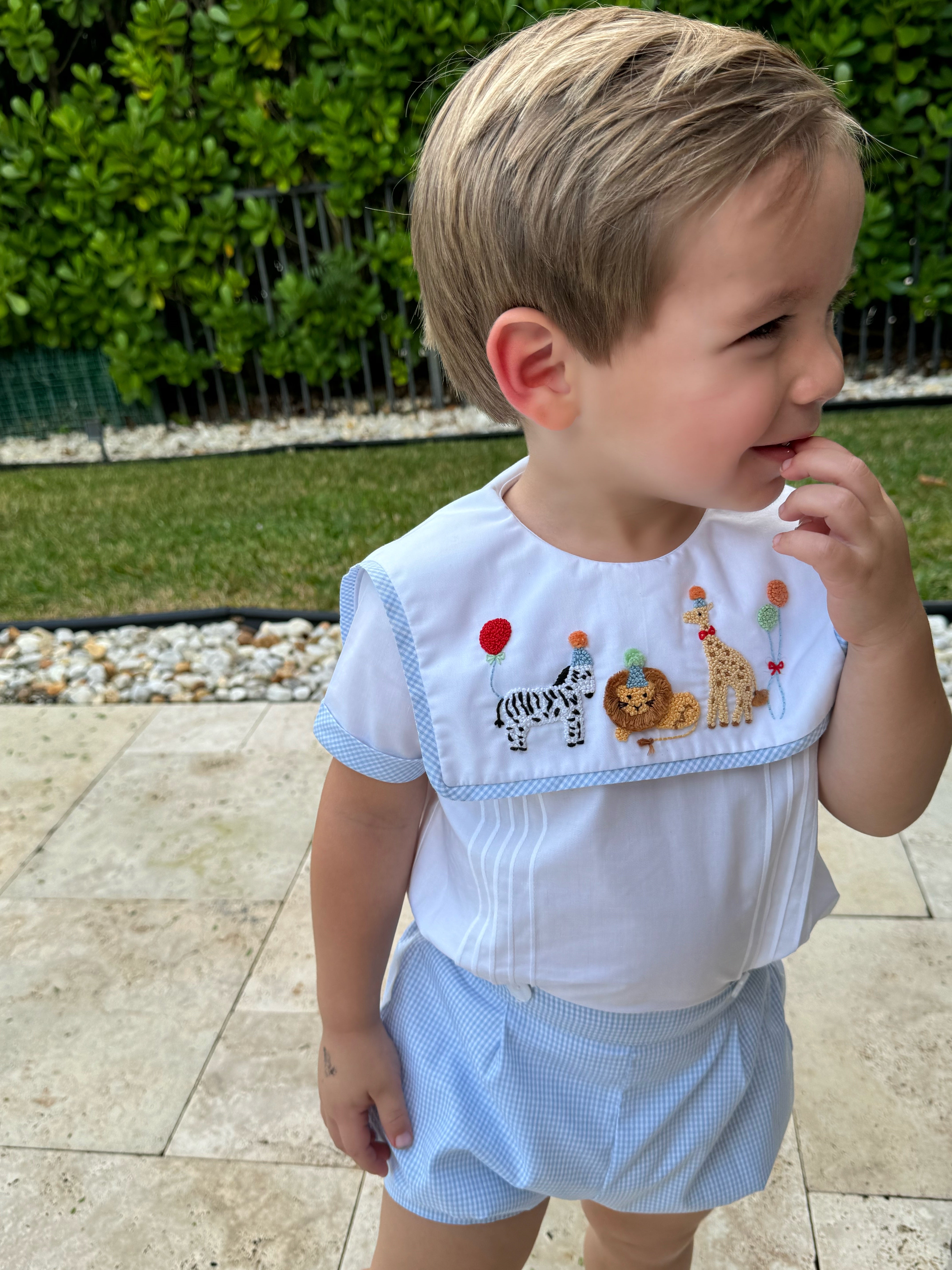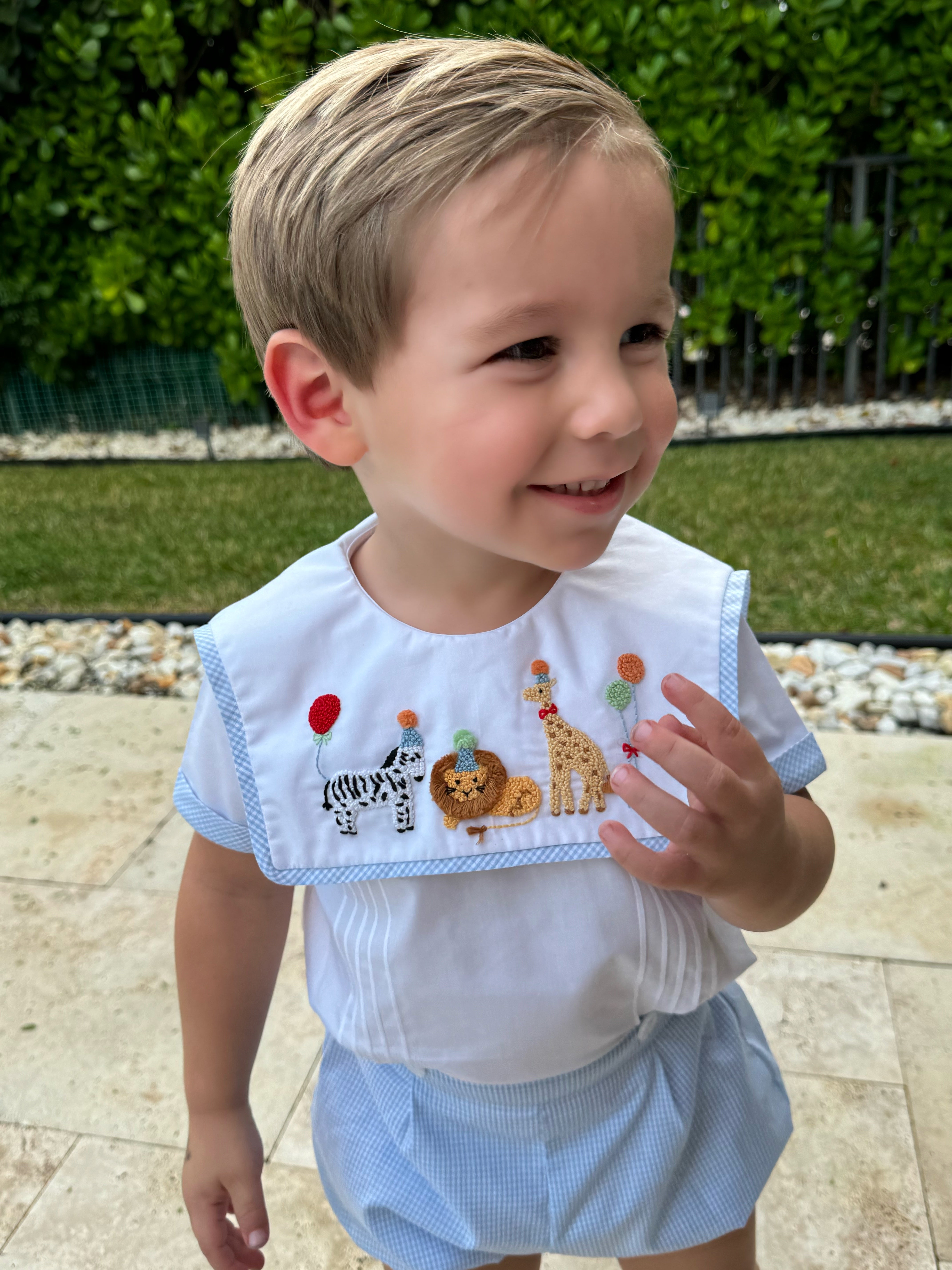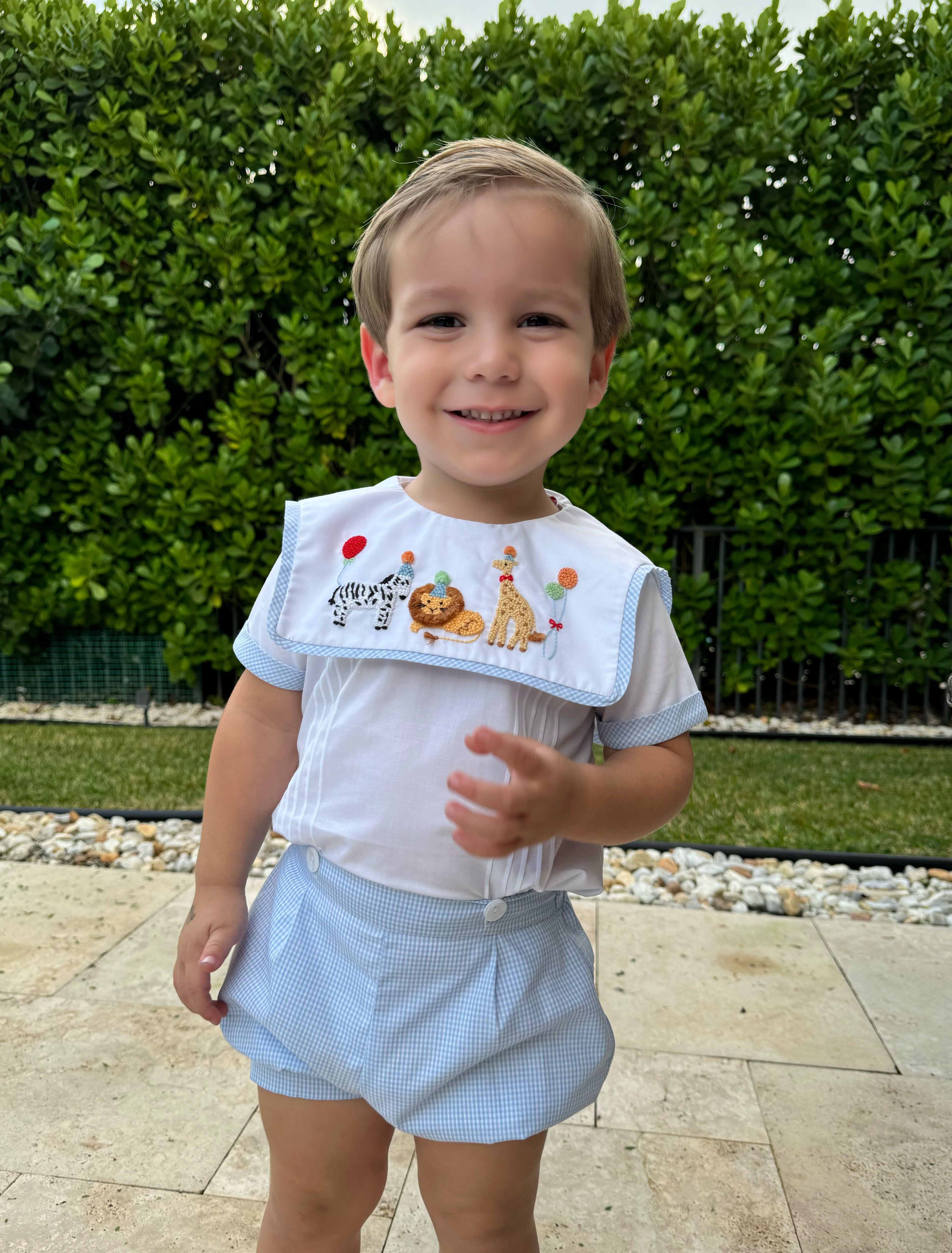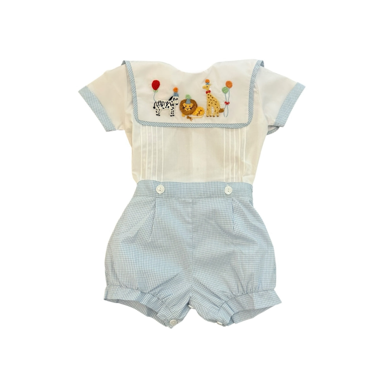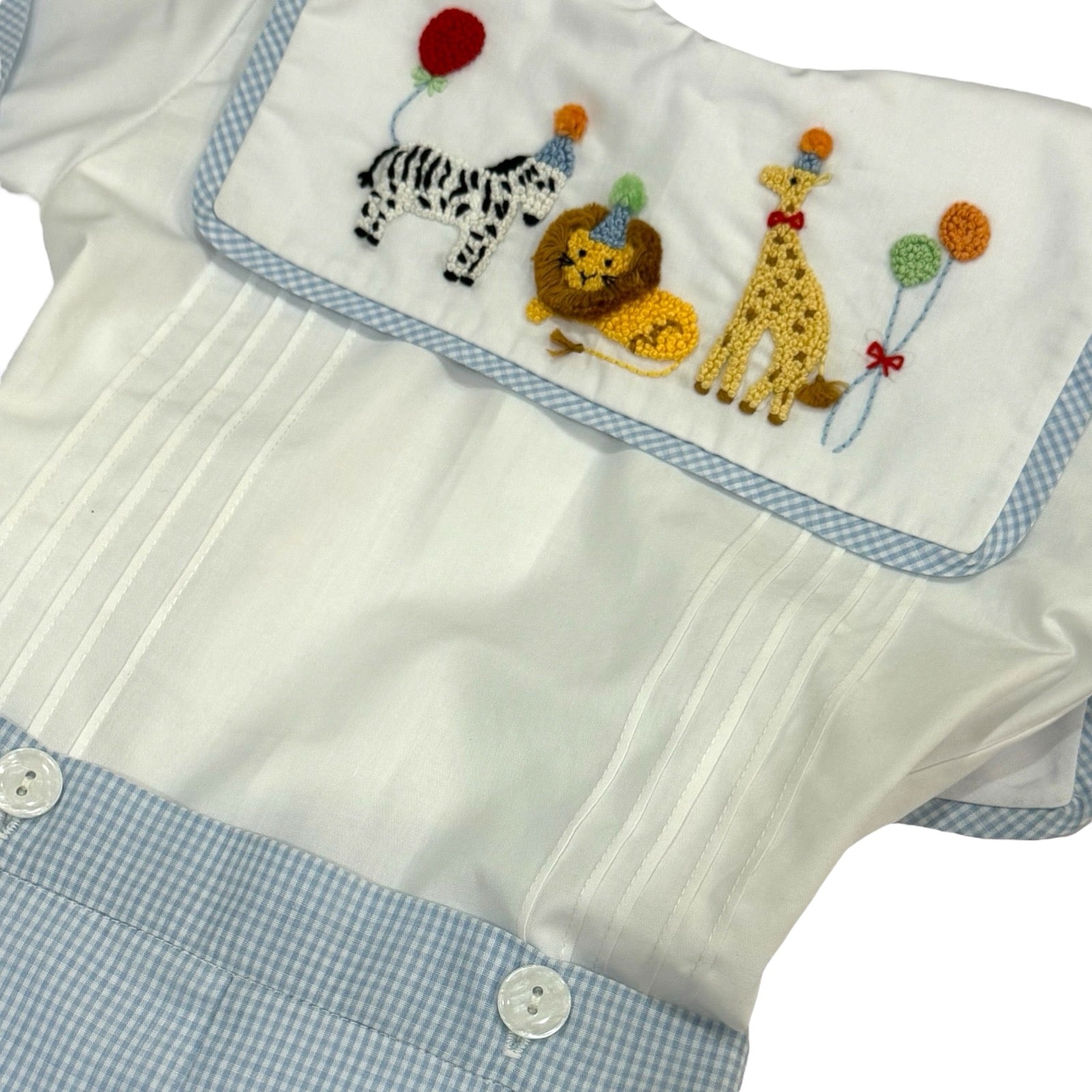 This adorable Party Animals French Knot two piece set is specially made for boys birthdays in mind. Featuring a lively party safari animals entirely handmade with intricate french knots. Set consists of a top with a sailor-like neckline and shorts that connect with two buttons. Made with high-quality cotton fabric.