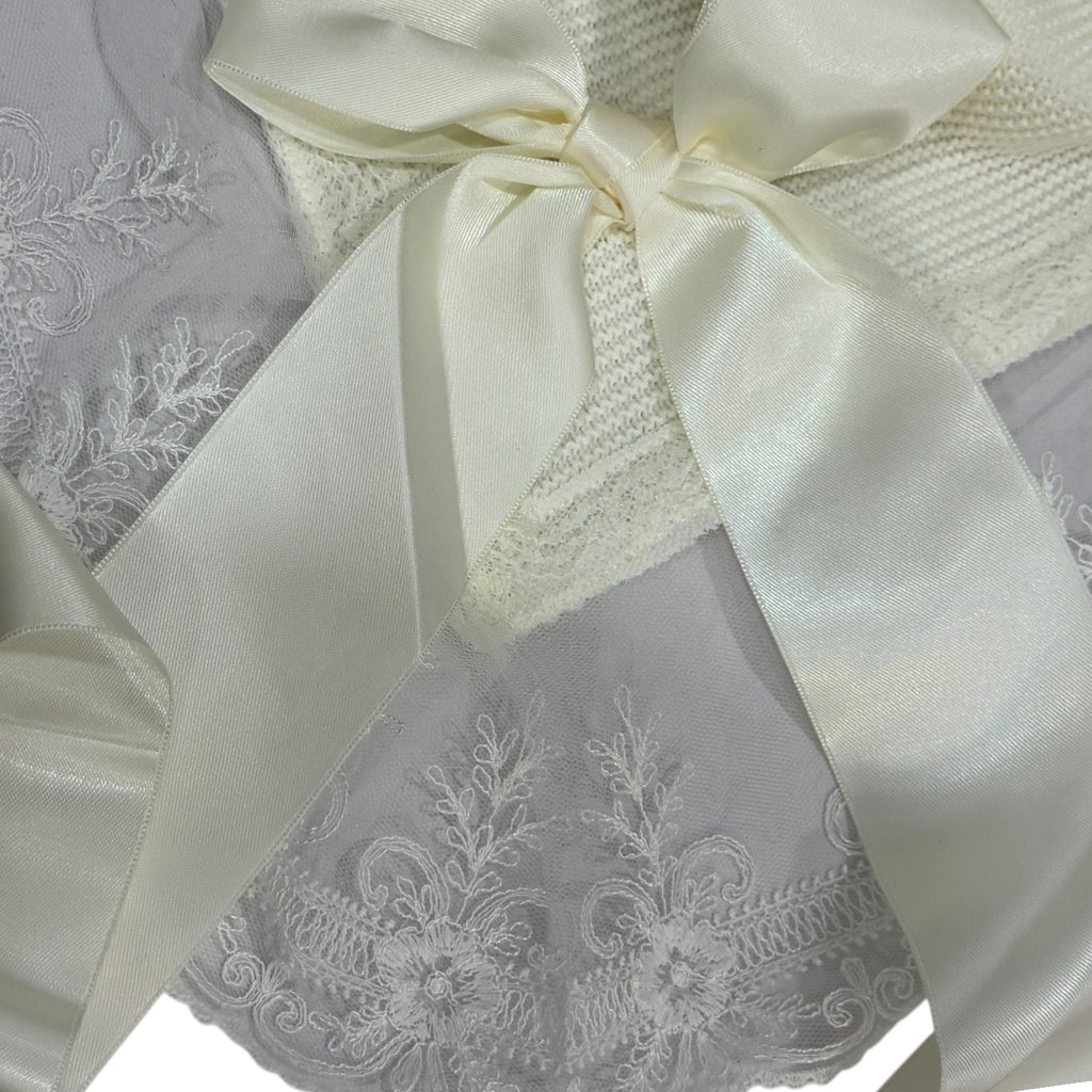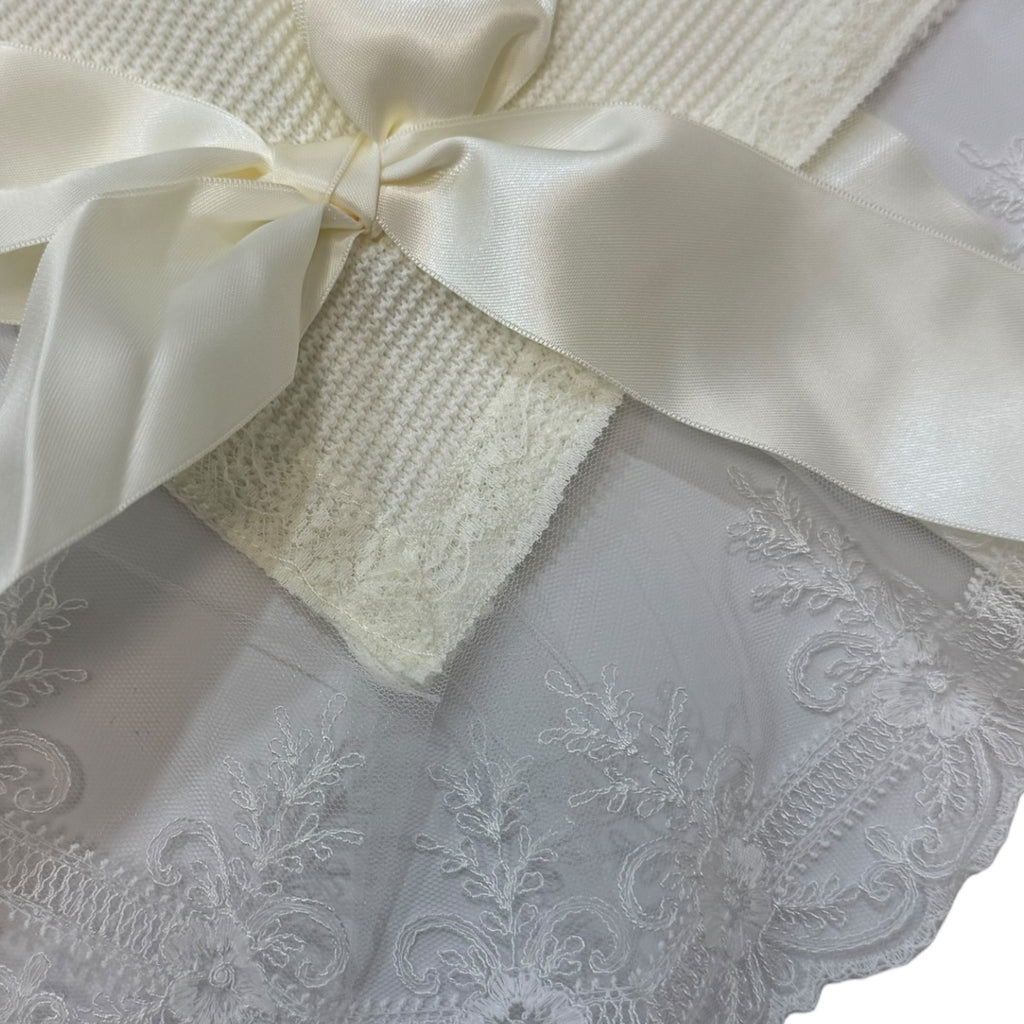 Stunning ivory blanket boasting a beautiful off-white lace and an ivory lace satin bow on one of the borders. Perfectly pairing with the Elle knitted set, this luxurious ensemble makes a great gift for any special event, great for that first newborn photoshoot, or hospital picture.