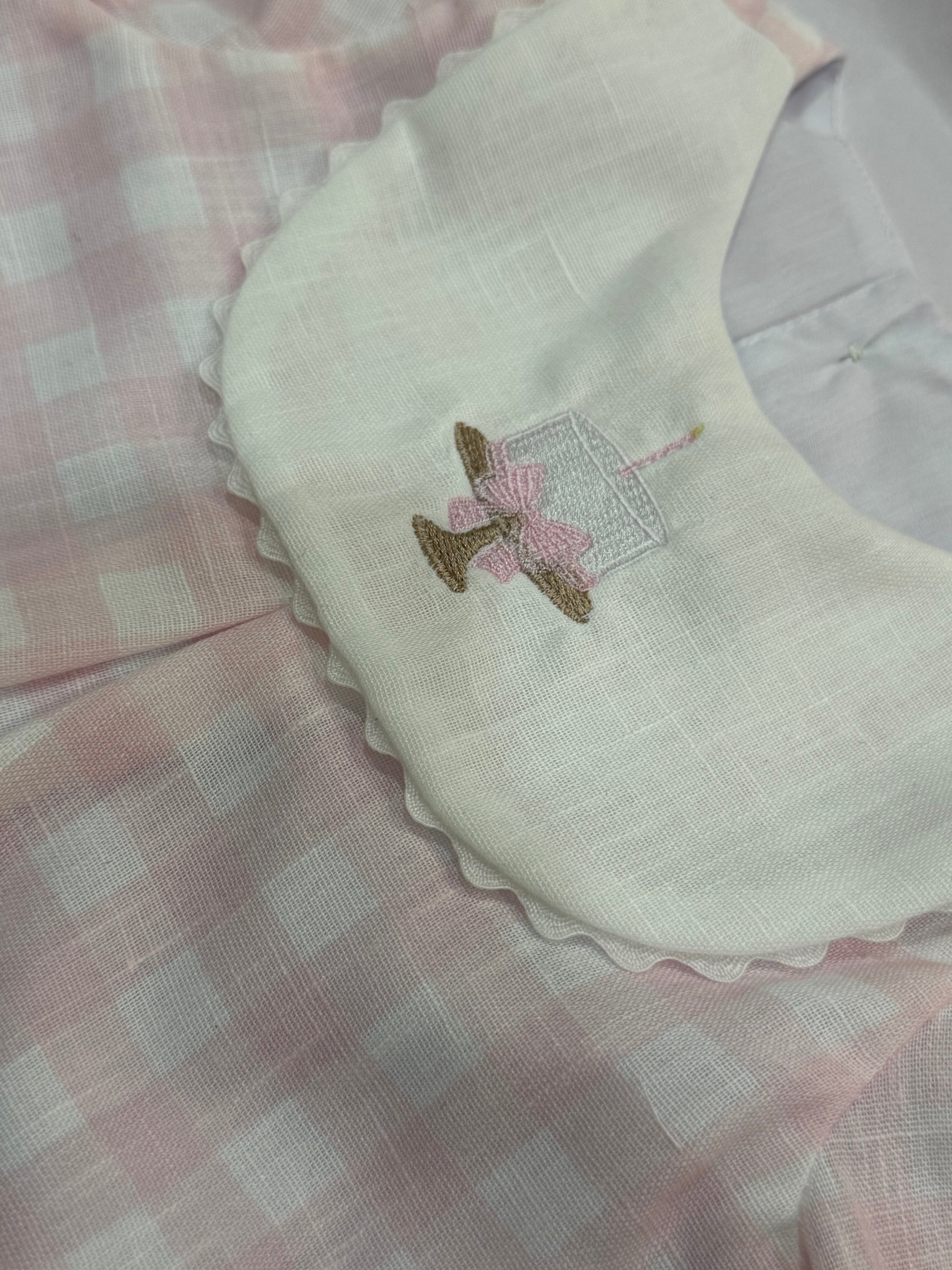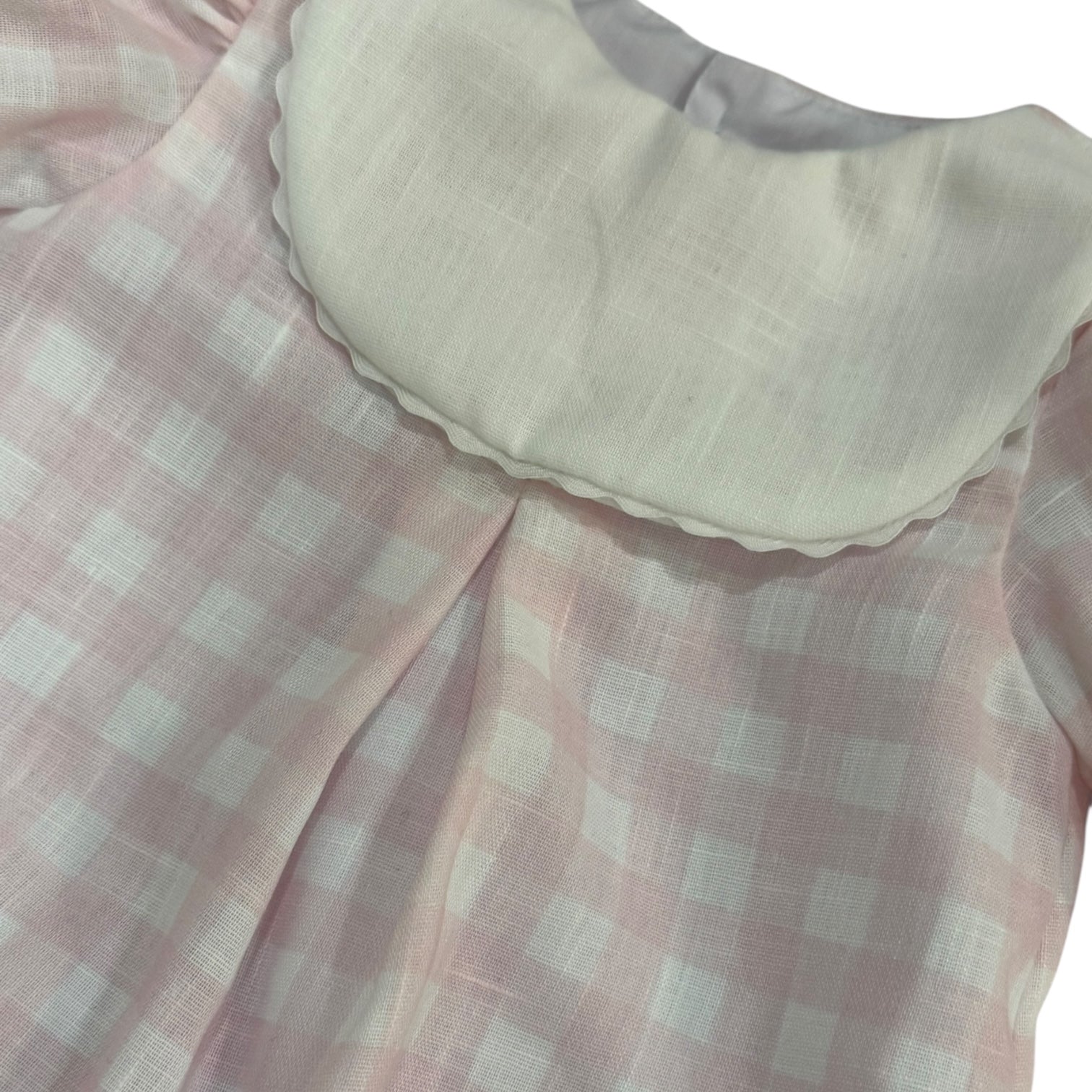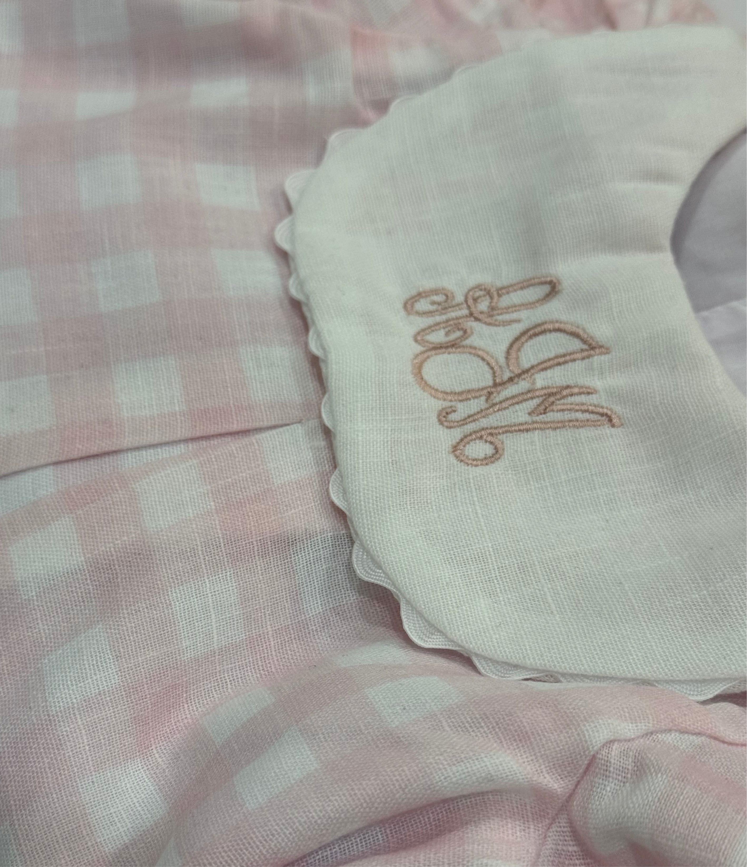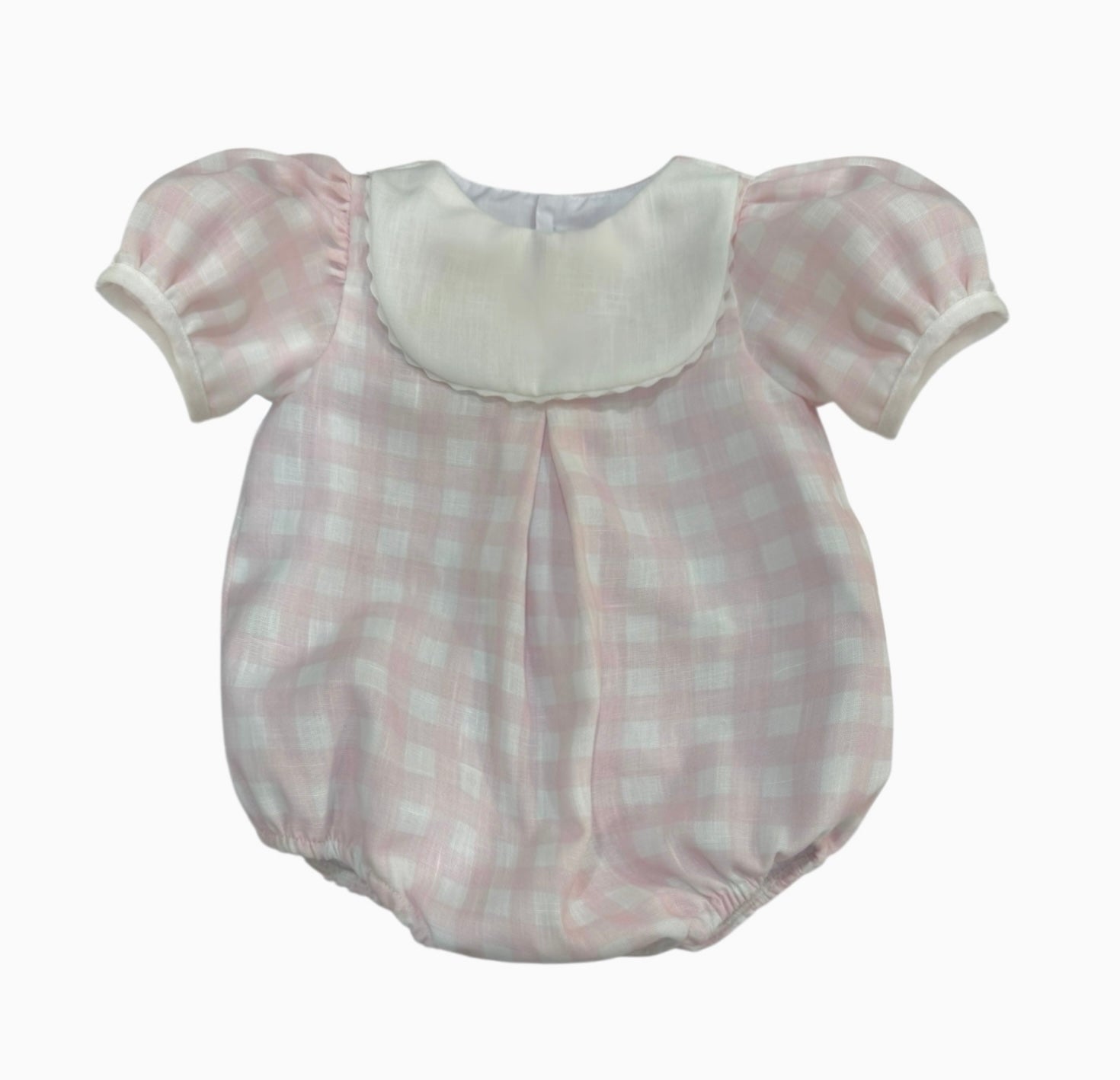 Beautiful Pink gingham romper for girls with a white bib that can be embroidered.