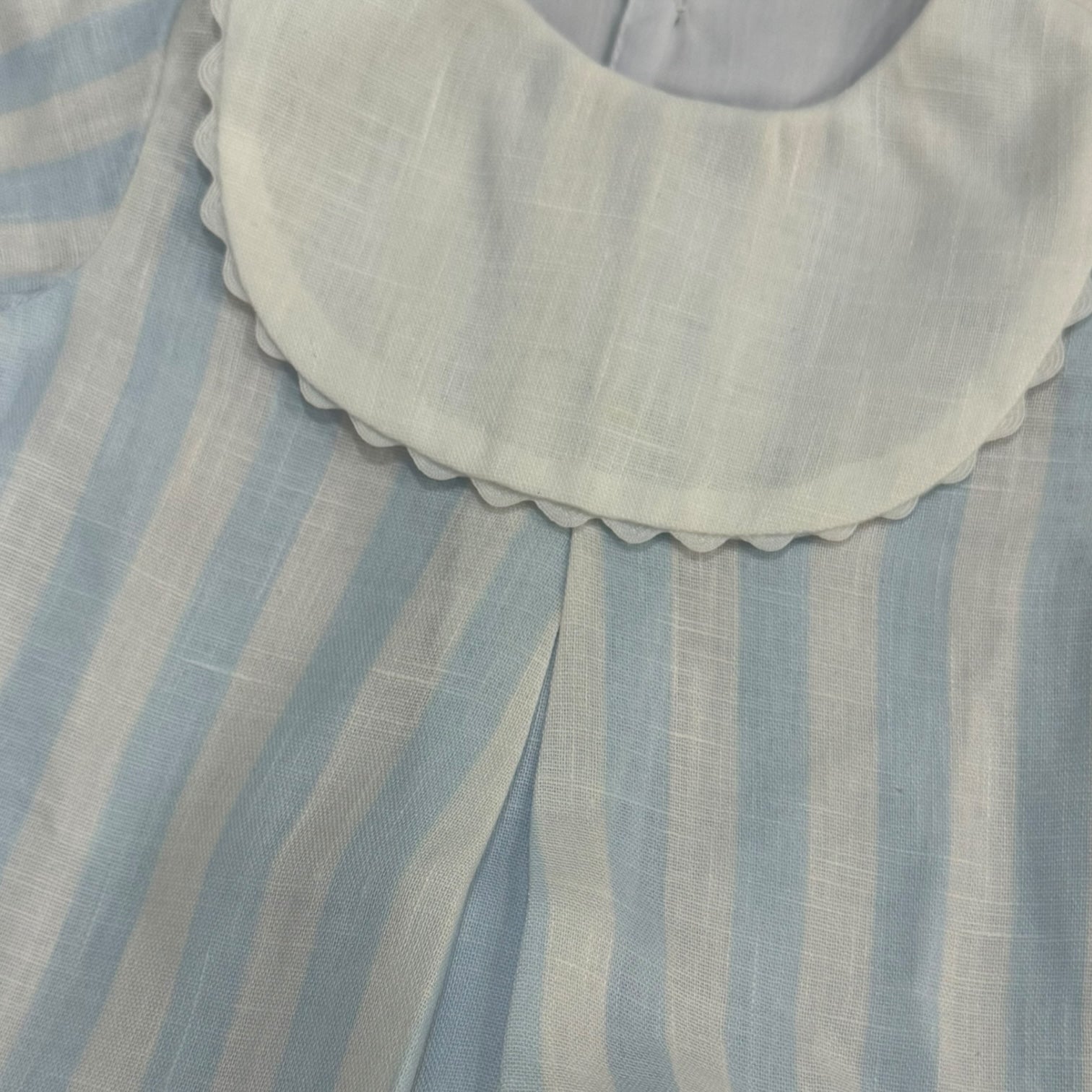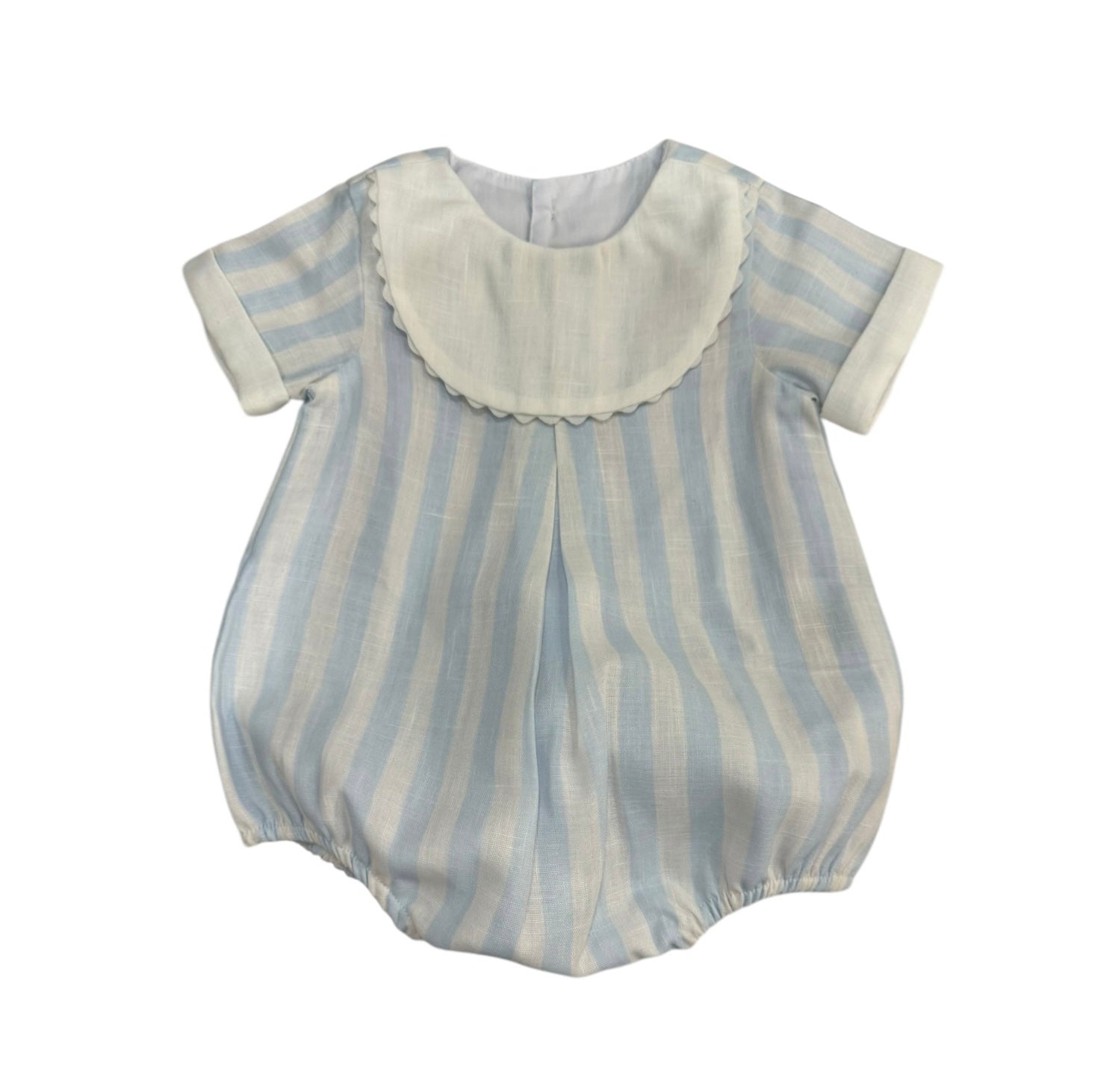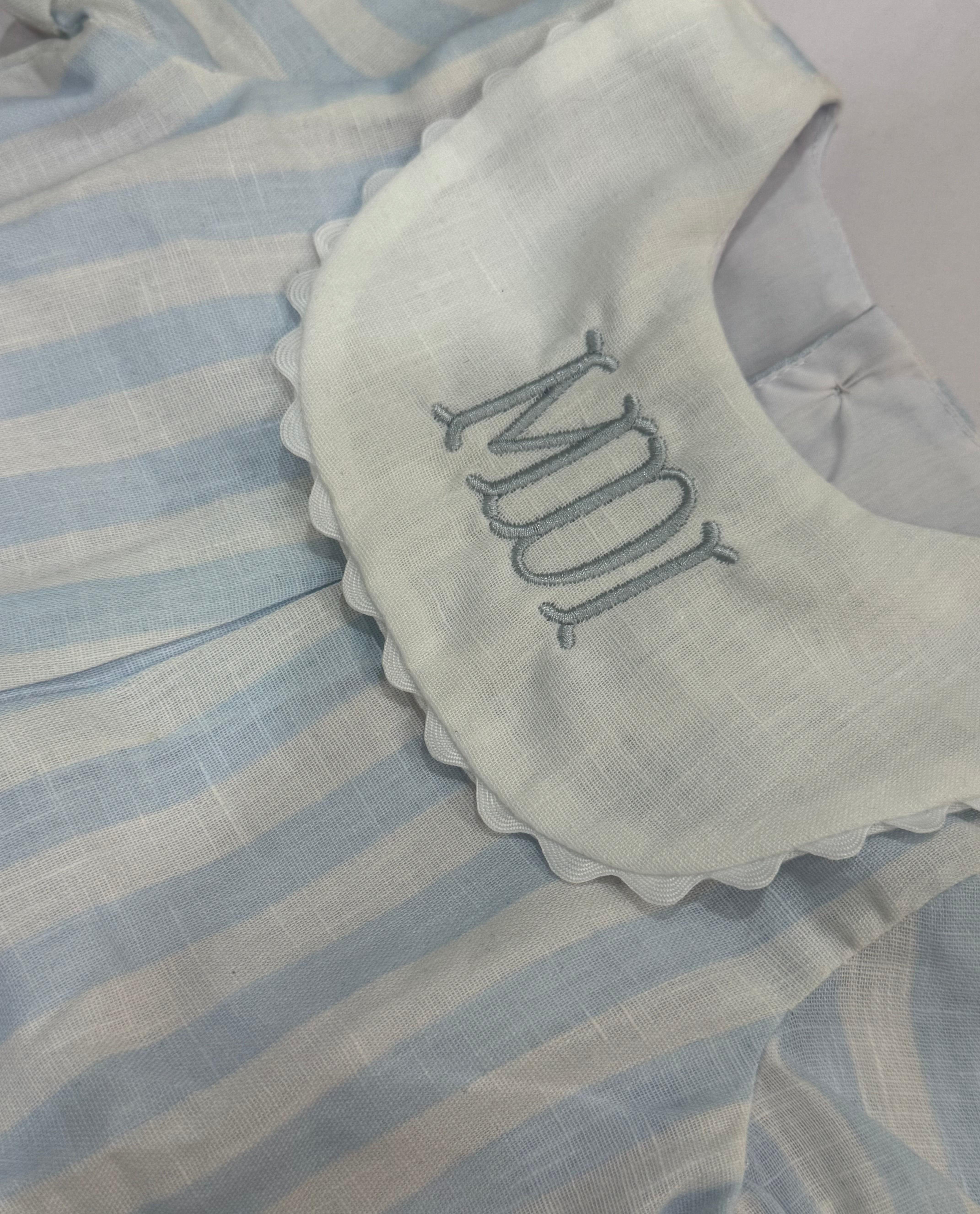 Beautiful light blue striped romper for boys with a white bib that can be embroidered.