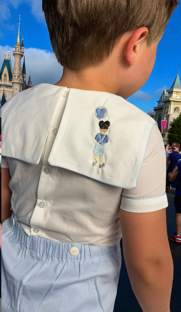 Preppy two piece set for boys, consisting on a white shirt with light blue trim, and matching light blue shorts.