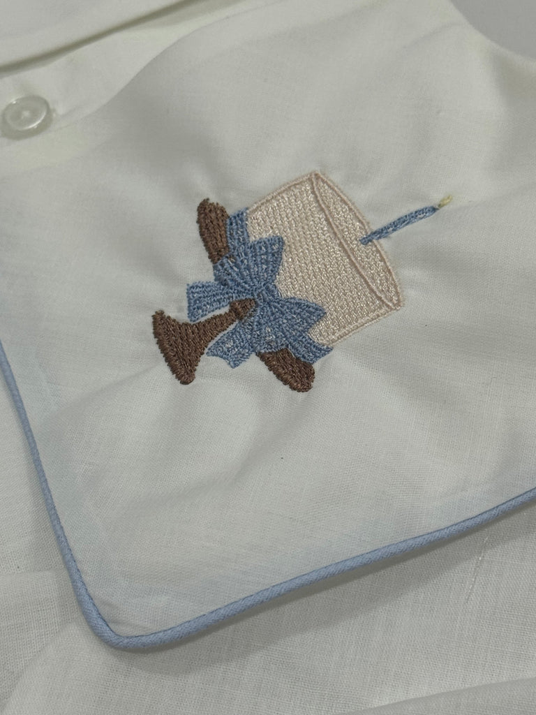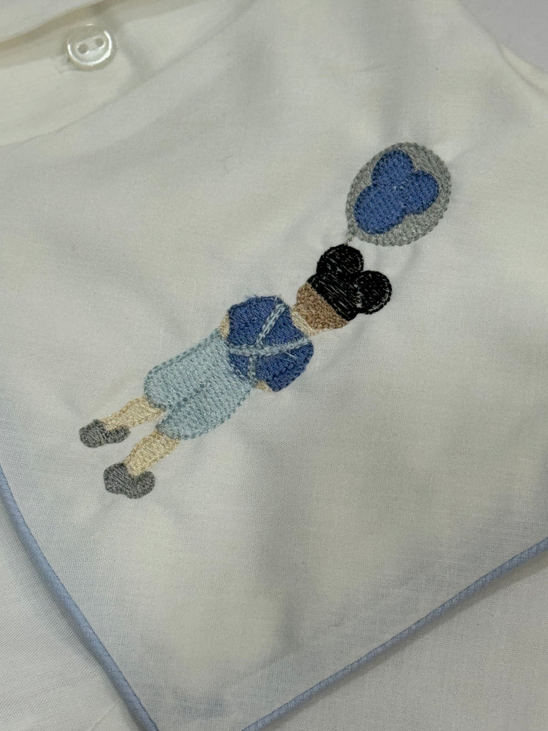 If you want extra embroidery on the back with a custom theme (as boy with the balloon on the picture please specify on the second text box above)