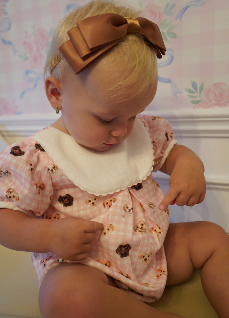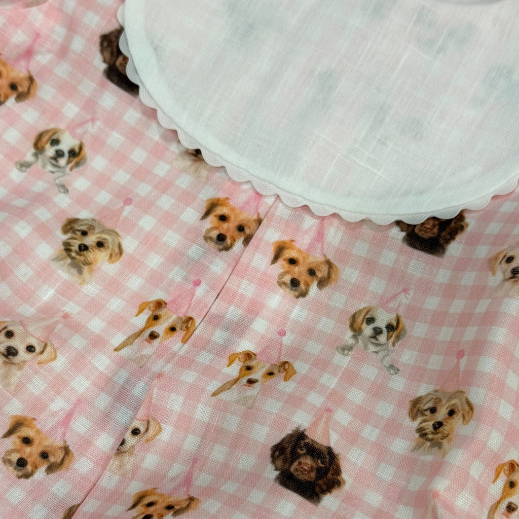 Beautiful Pink gingham romper featuring dogs with party hats. It has a white bib that can be embroidered at no extra cost.