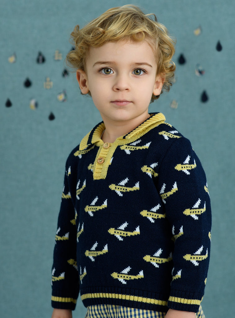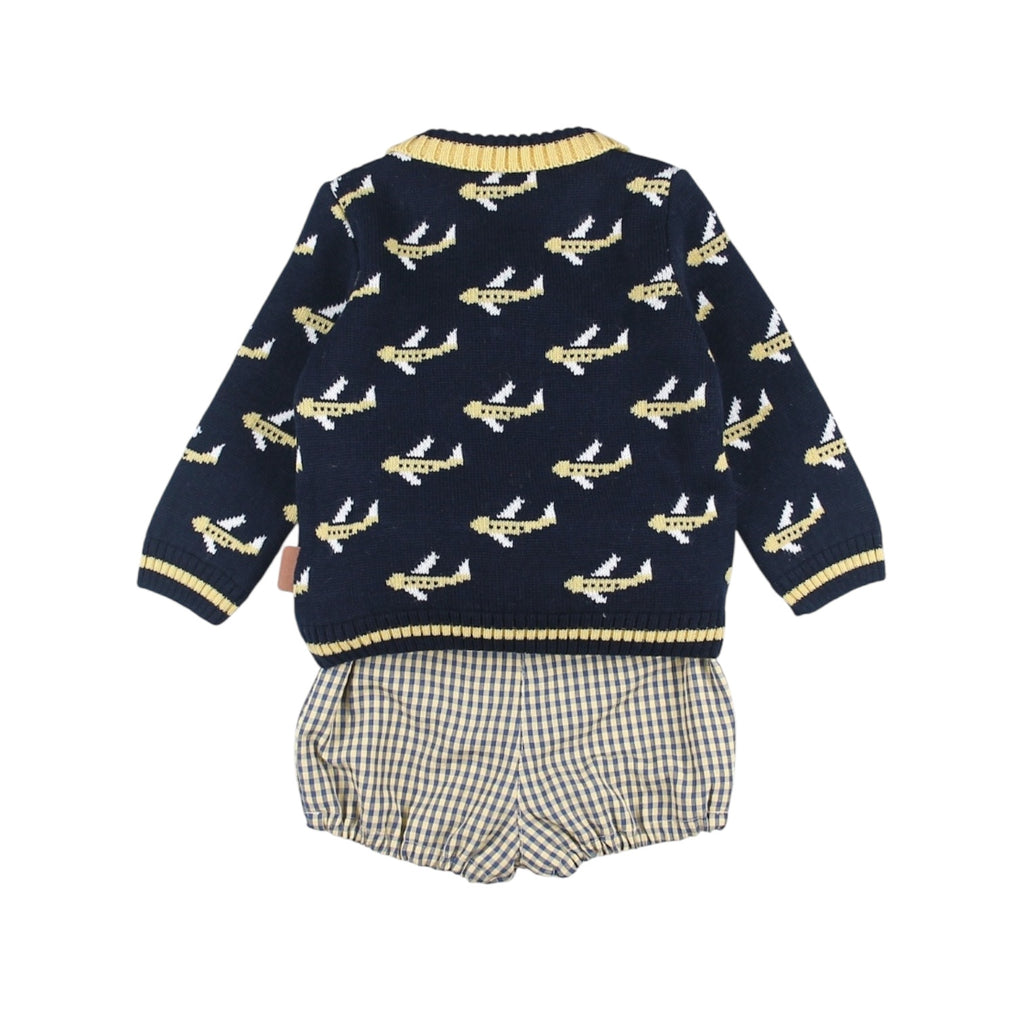 A different and stunning set featuring airplanes knitted on the sweater and gingham shorts.