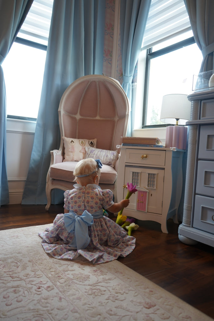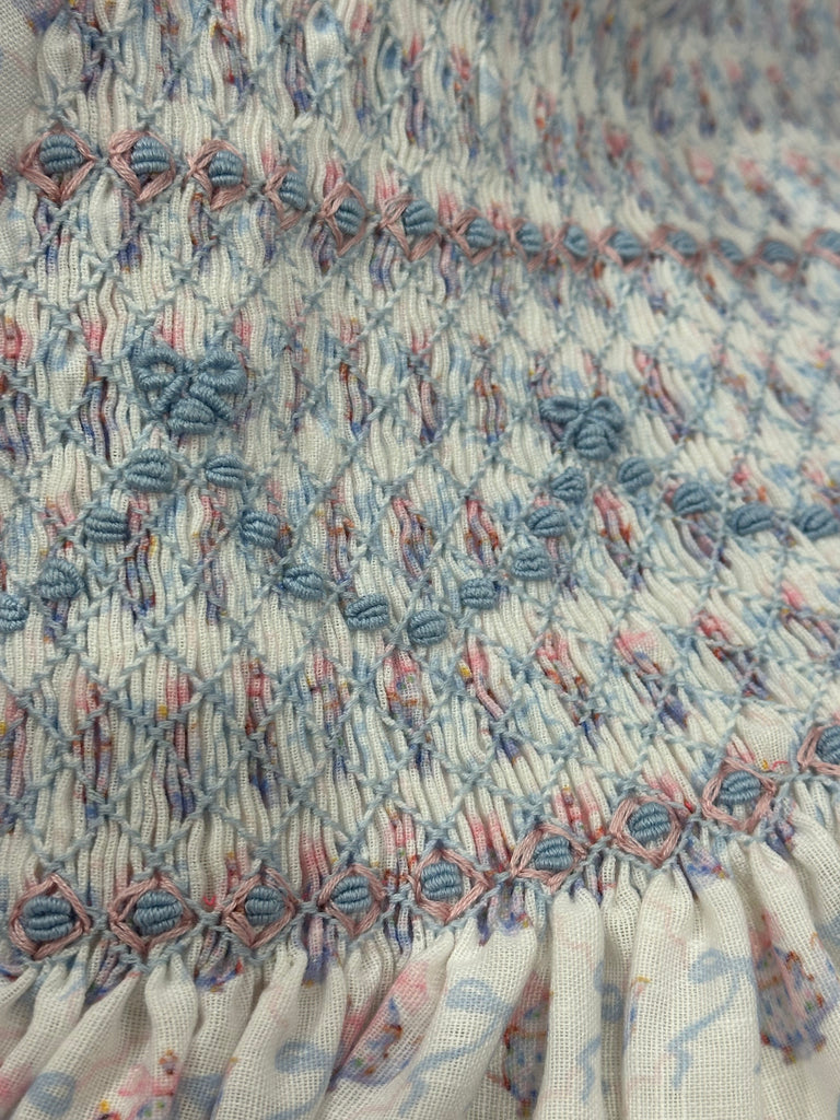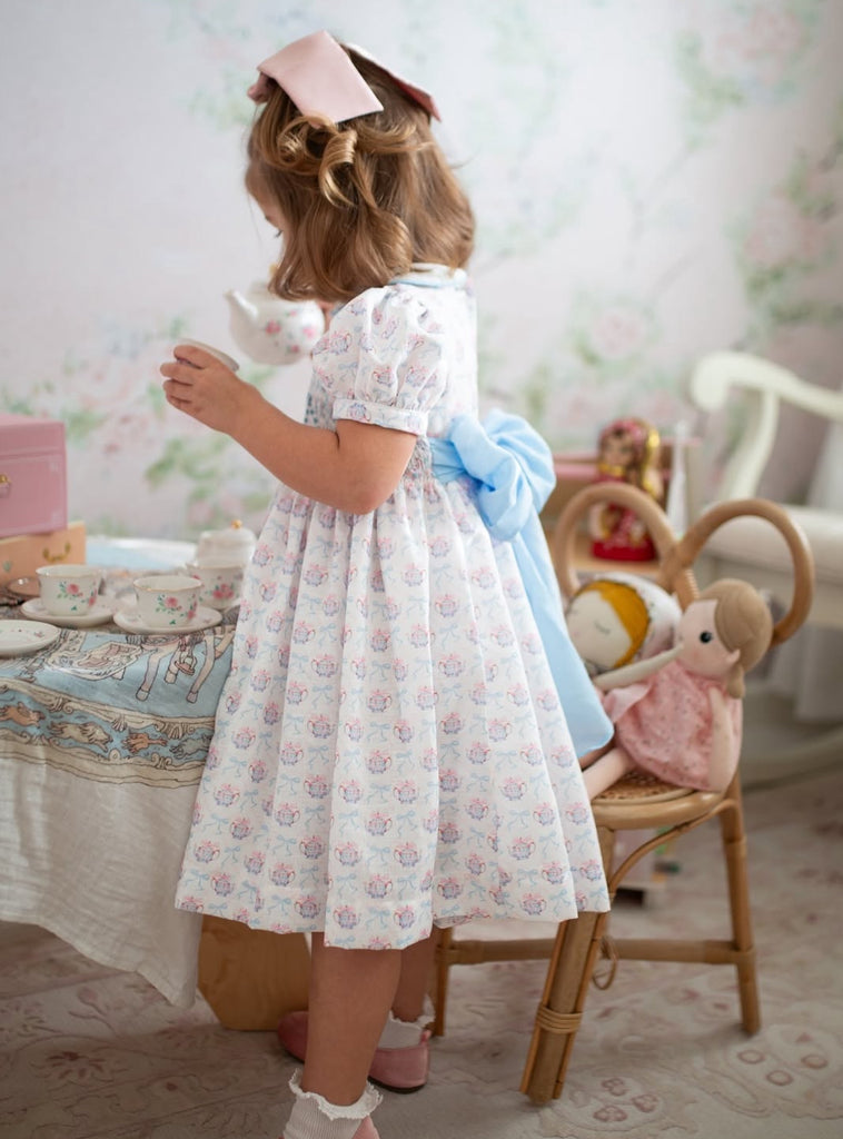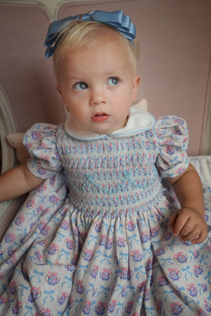 The dress is a masterpiece of craftsmanship, featuring delicate handsmocking that highlights the skill and talent of our artisans. Made from luxurious fabric adorned with charming tea pots and dainty bows, this dress is as elegant as it is timeless. Plus, the XL light blue bow on the back adds a touch of charm to this already stunning piece.