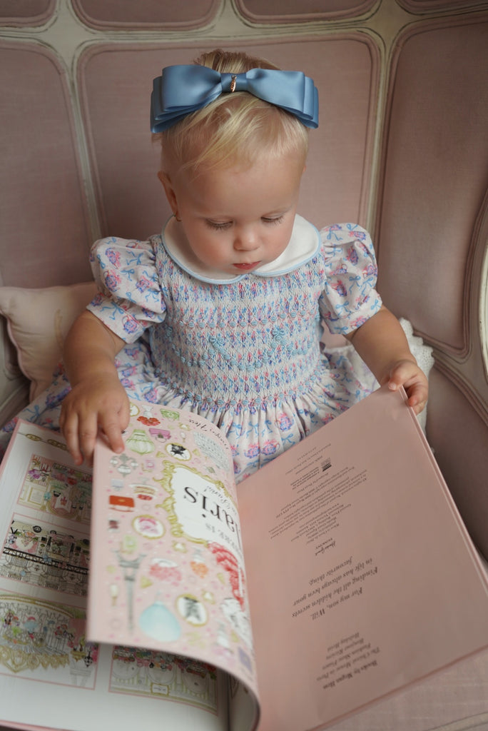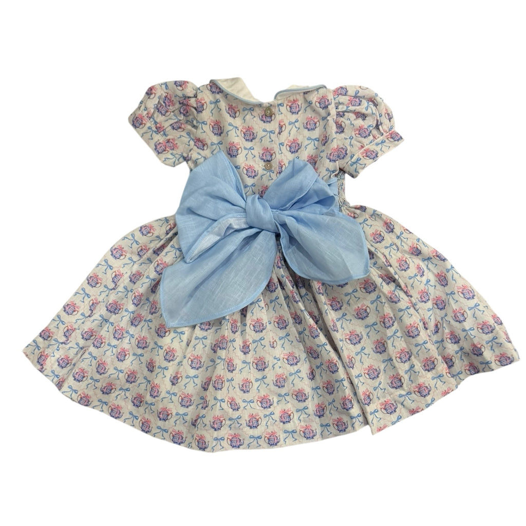 Alicia Tea Time Bow Blue and Pink Coquette Handsmocked Dress