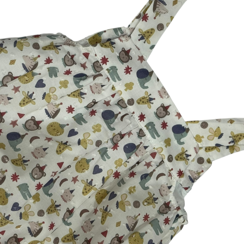 Bubble/Romper for boys crafted in a super cute fabric featuring party animals with birthday hats.