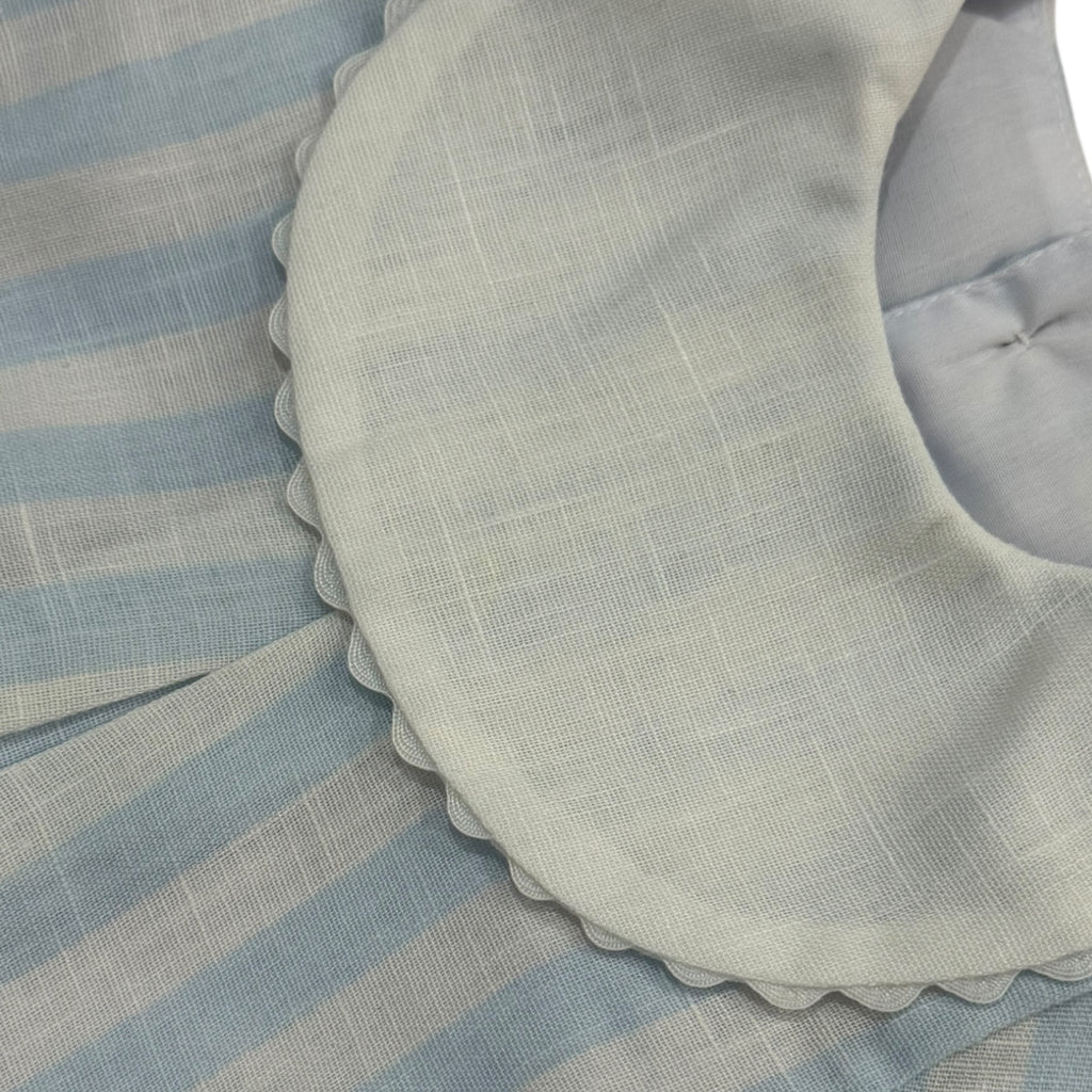 Beautiful light blue striped romper for boys with a white bib that can be embroidered.