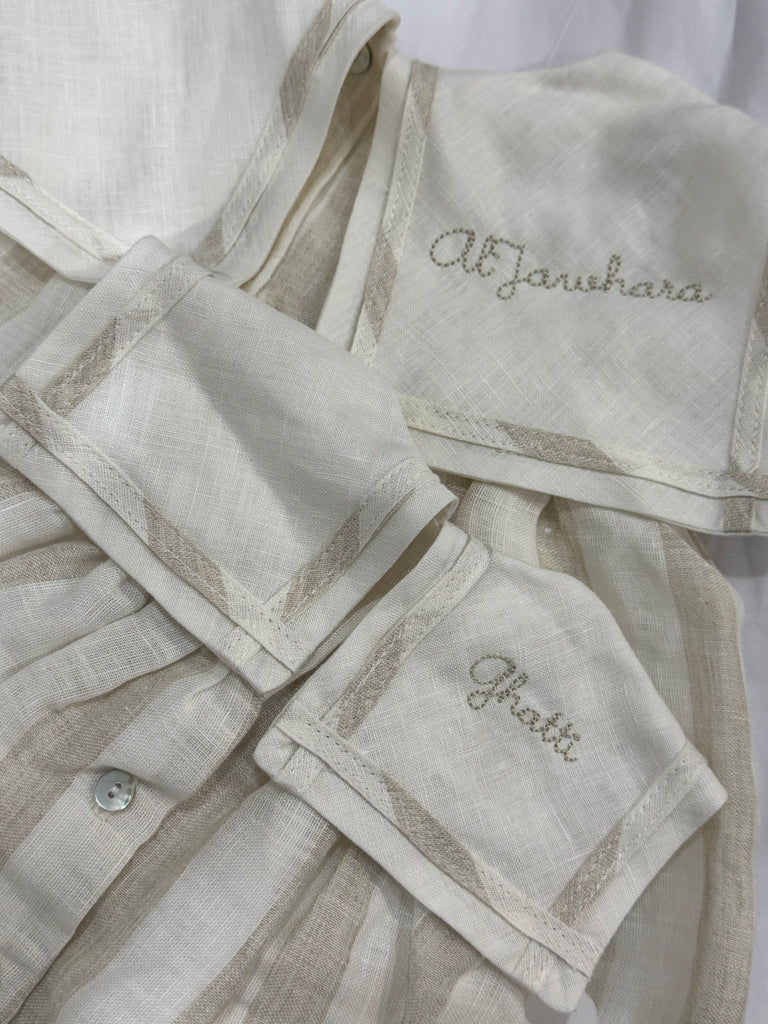 Cute boy romper crafted in a 100% cotton beige and white striped pattern, has a sailor collar.