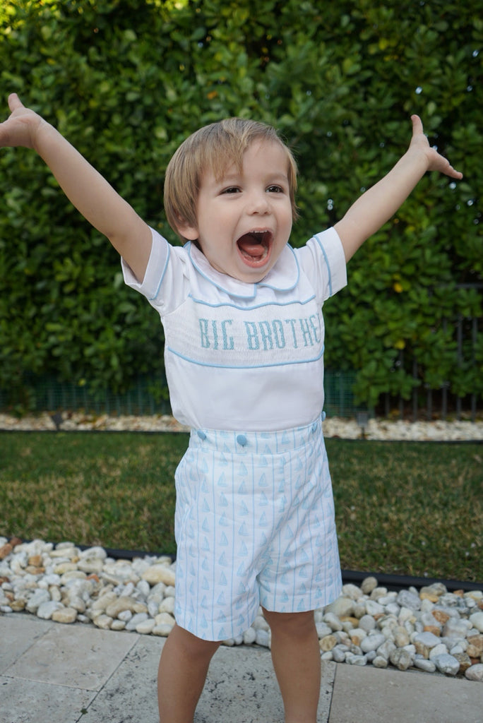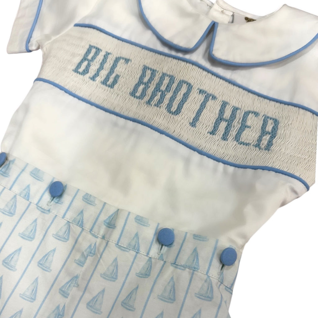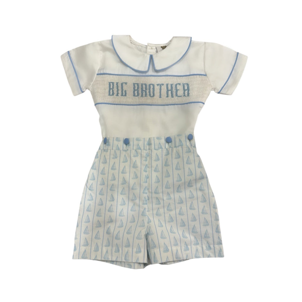 This adorable set for boys is handmade in 100% cotton. The shirt is white with light blue trima, to match the sailing boat themed shorts. The shirt is handsmocked with the words” Big Brother”