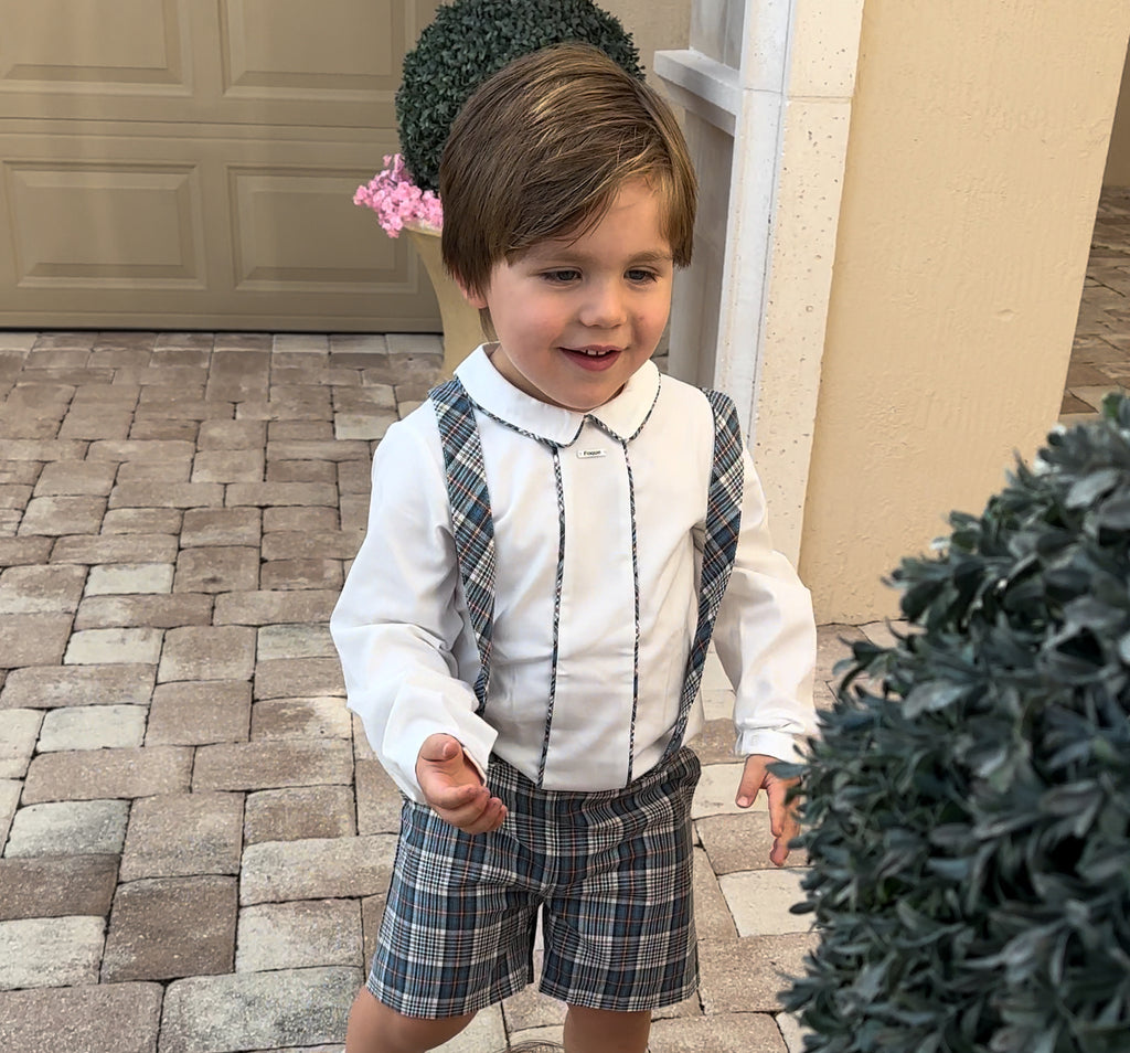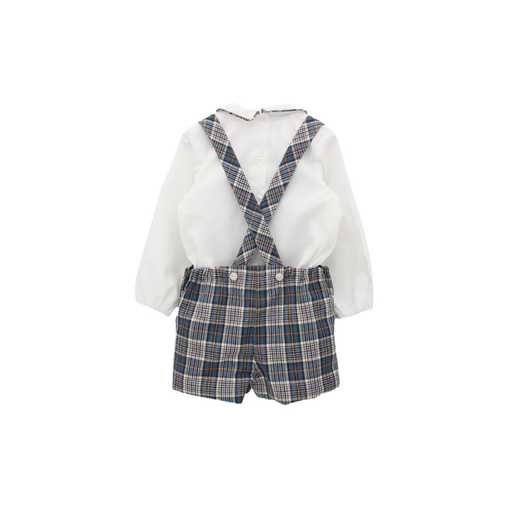 Beautiful tartan set for boys. Consisting on a white shirt with blue tartan details, and a blue tartan romper.