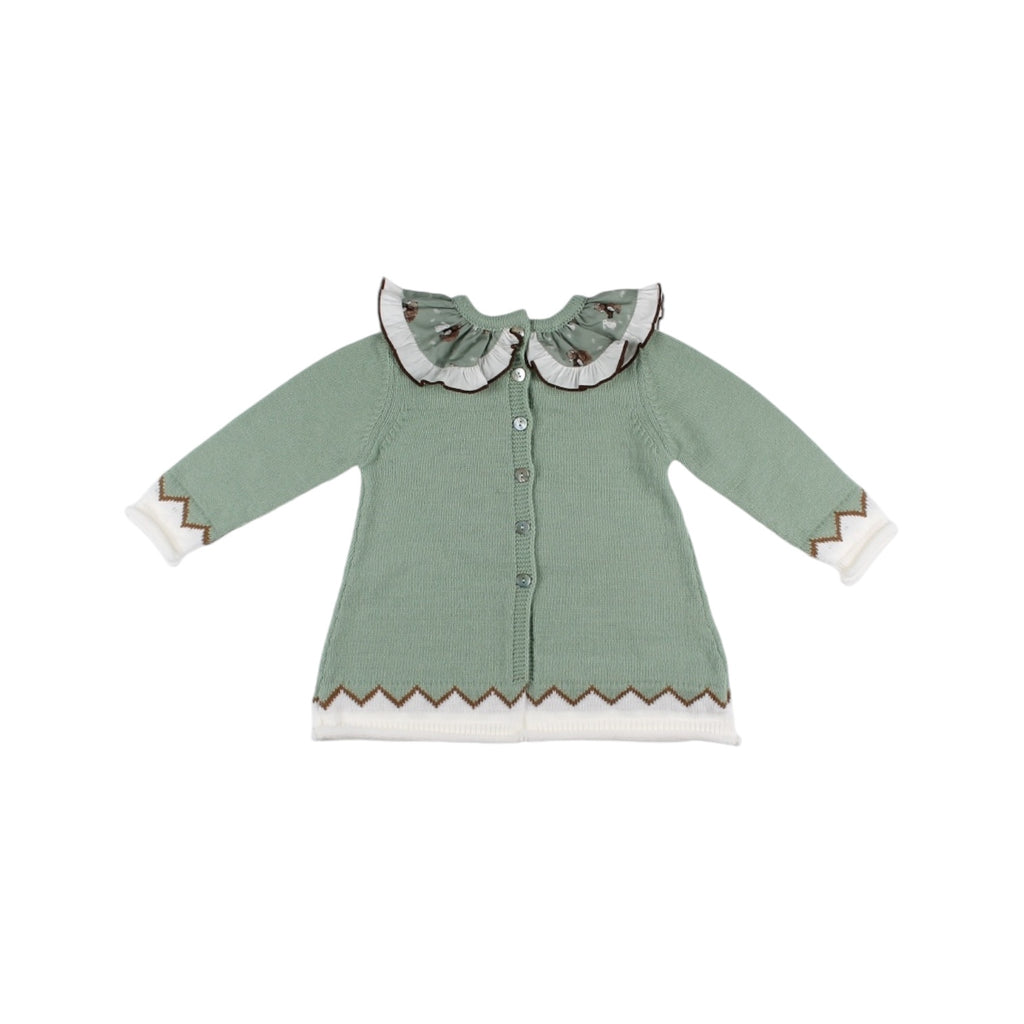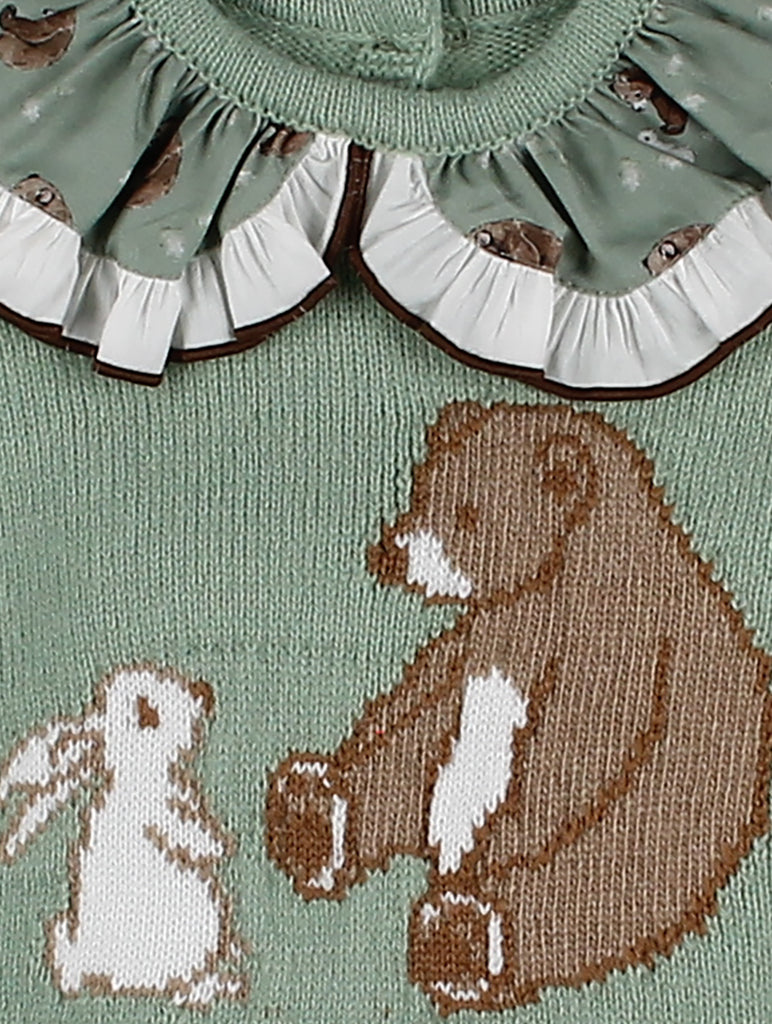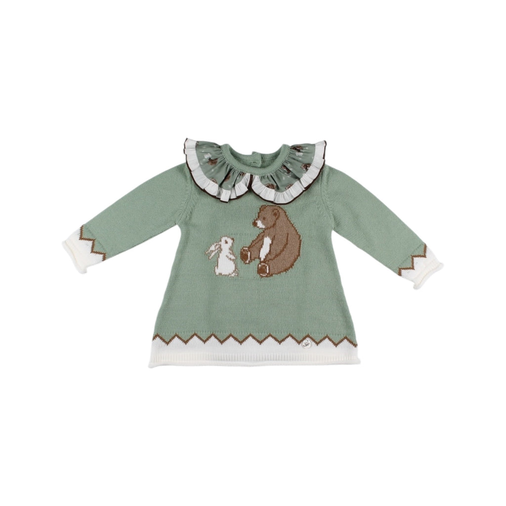Professionally crafted and designed in Spain, this adorable green knitted dress featuring a bear and bunny is perfect for little girls.