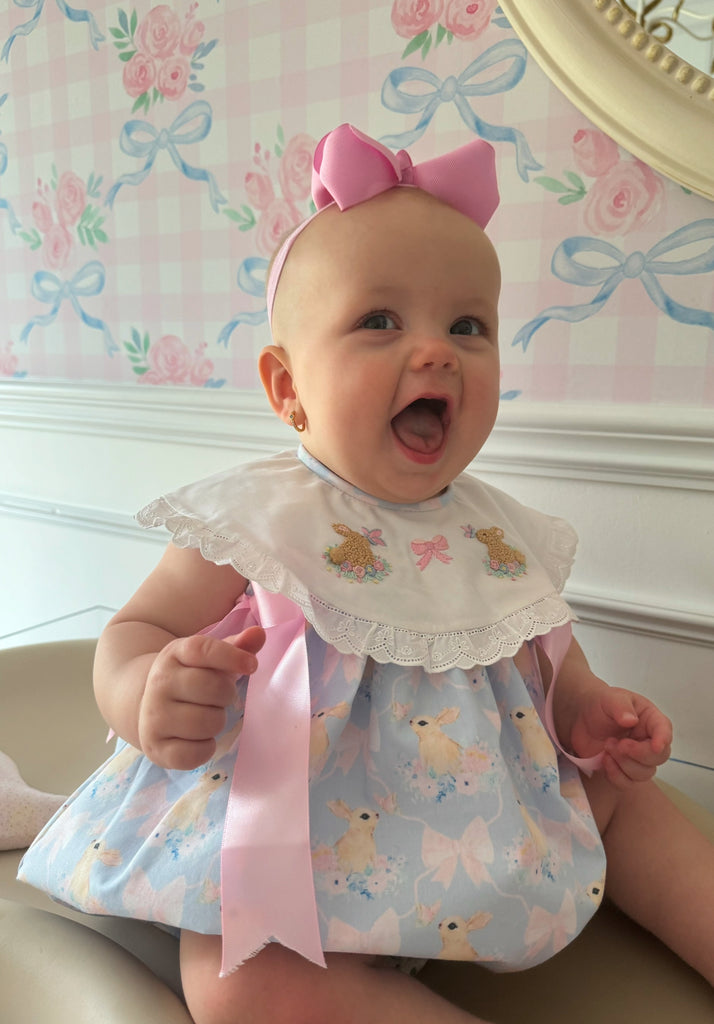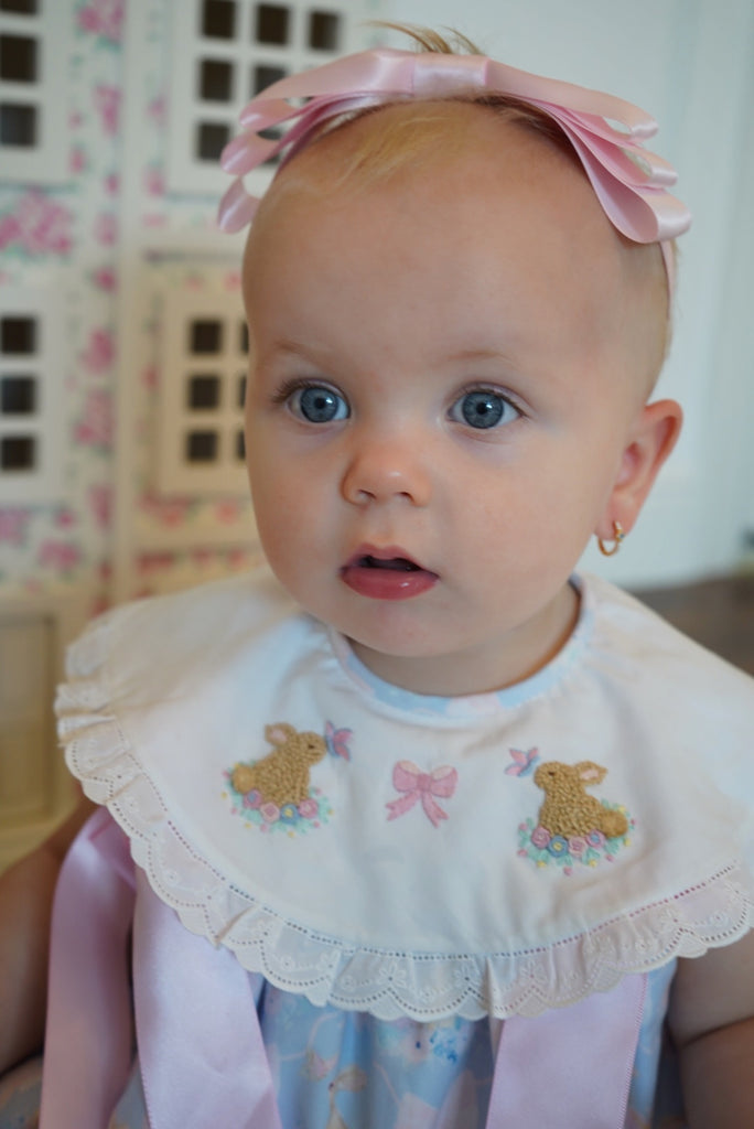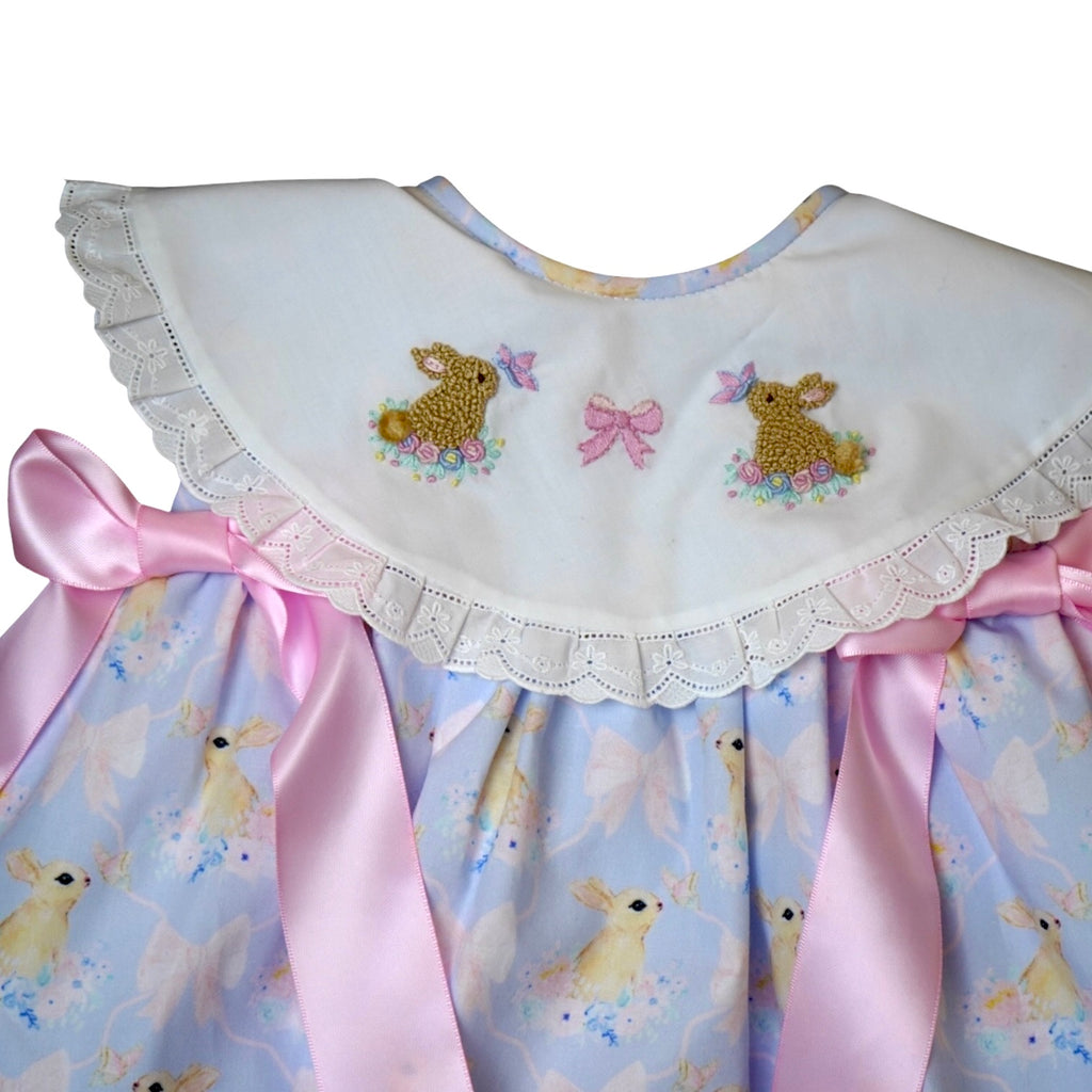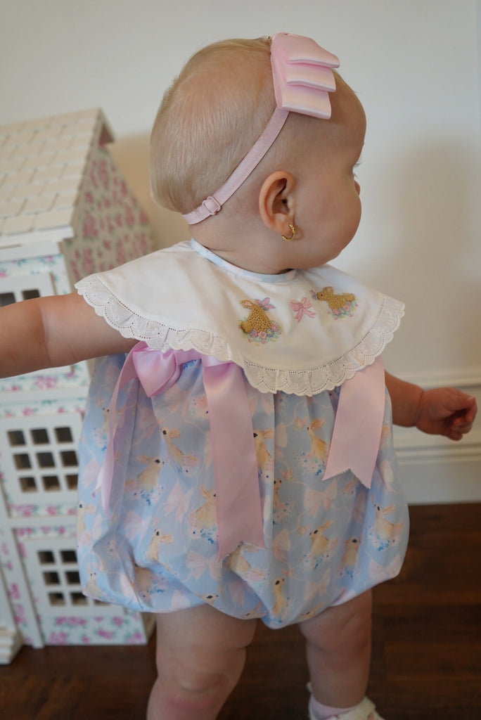 EXCLUSIVE alert! Extremely cute sleeveless romper with a oversized white collar, handmade, and handembroidered with french knot bunnies.